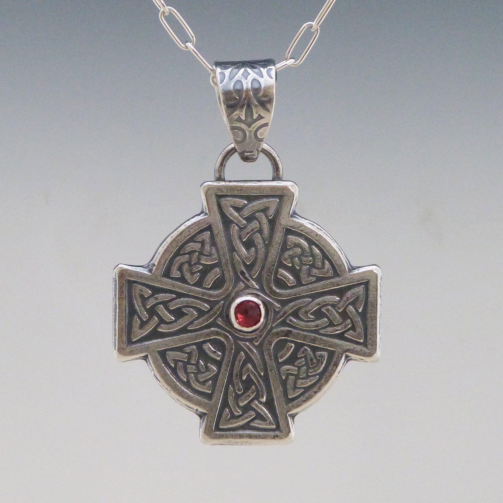 This unique Celtic Cross is anything but ancient history! Crafted from fine .999 silver and set with a 4mm faceted Garnet, it's an utterly timeless piece. The Argentium silver bail ensures it'll last through the ages. Handmade with love and a touch of Celtic magic, it's truly one-of-a-kind. Go back in time with this one! Oval link silver chain. Pendant is 1 & 1/4" in length and width.