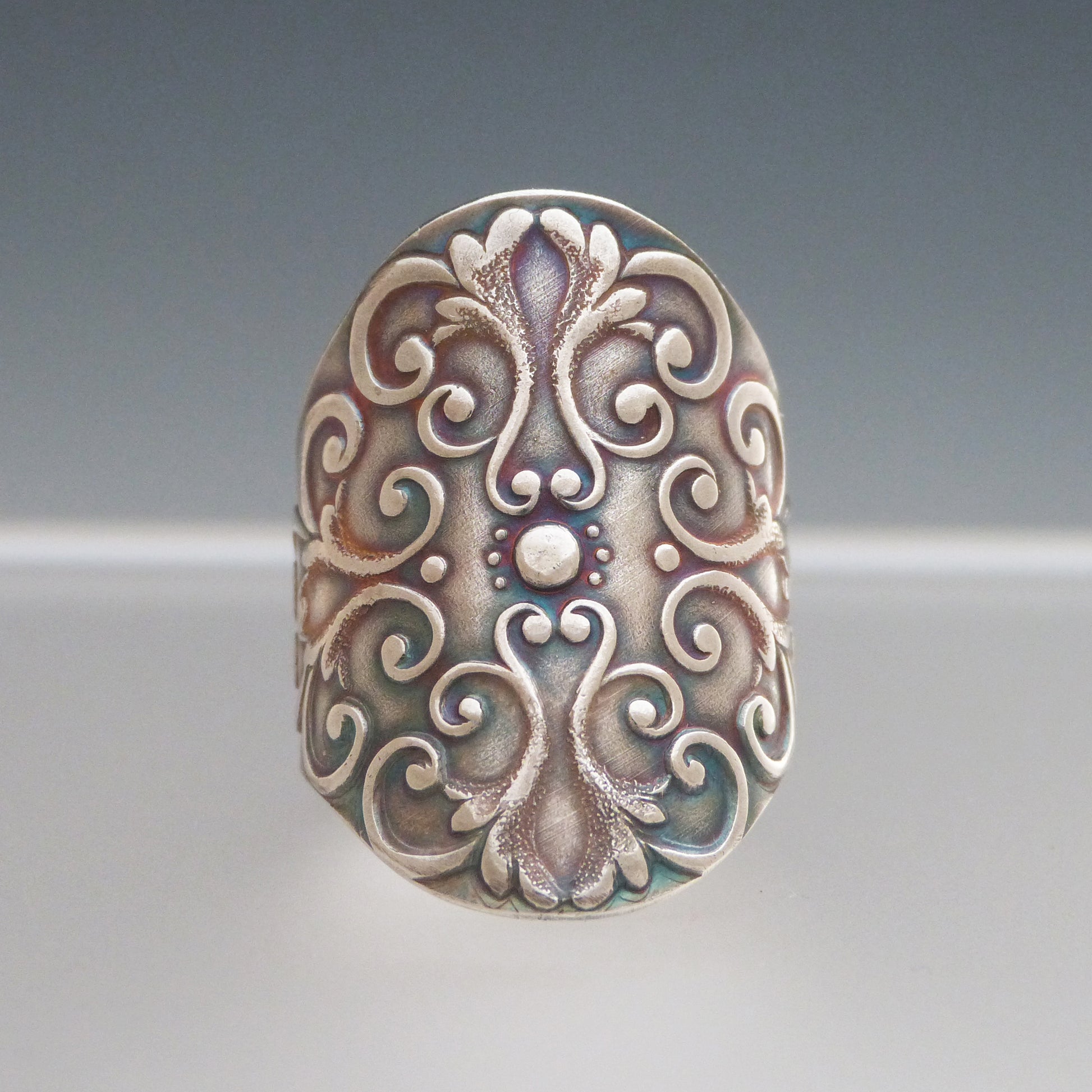 This Art Nouveau Ring is size 8 3/4 and ready to take you back to the era of French Art Nouveau. It's made by pressing .999 fine silver into a vintage die crafted by hand. Showcasing a beautiful hand-rubbed patina and intricate details, this ring measures about 1 3/16" on the top and 3/8" on the bottom - so unique it could only be one of a kind!