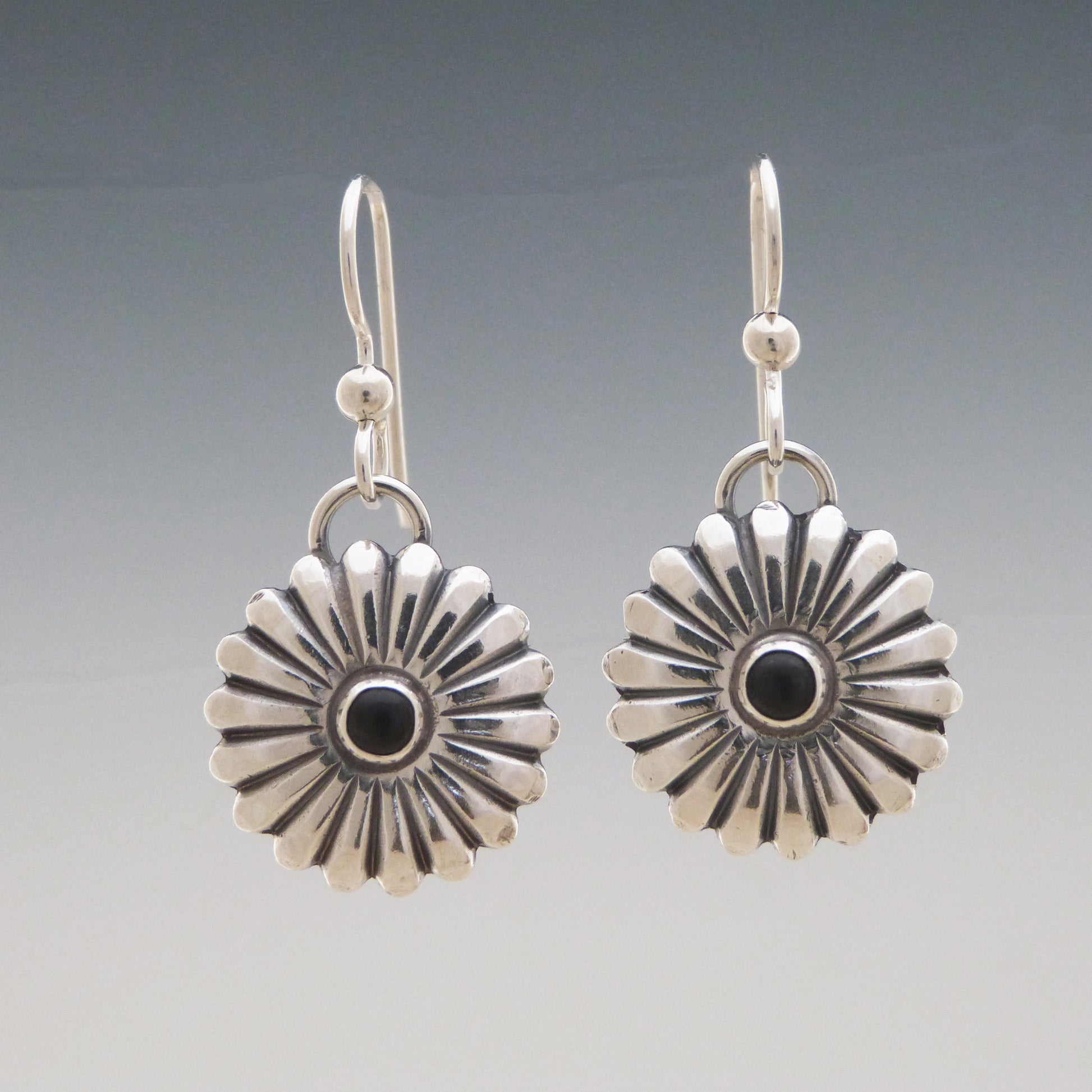 These Black Onyx Concho Southwestern Style earrings are approx. 2 mm long and 2 mm wide. They are crafted using fine .999 silver. The 4 mm black Onyx completes the fun concho design. These earrings are made using antique dies that create detailed 3-dimensional shapes. Sterling silver ear wires.