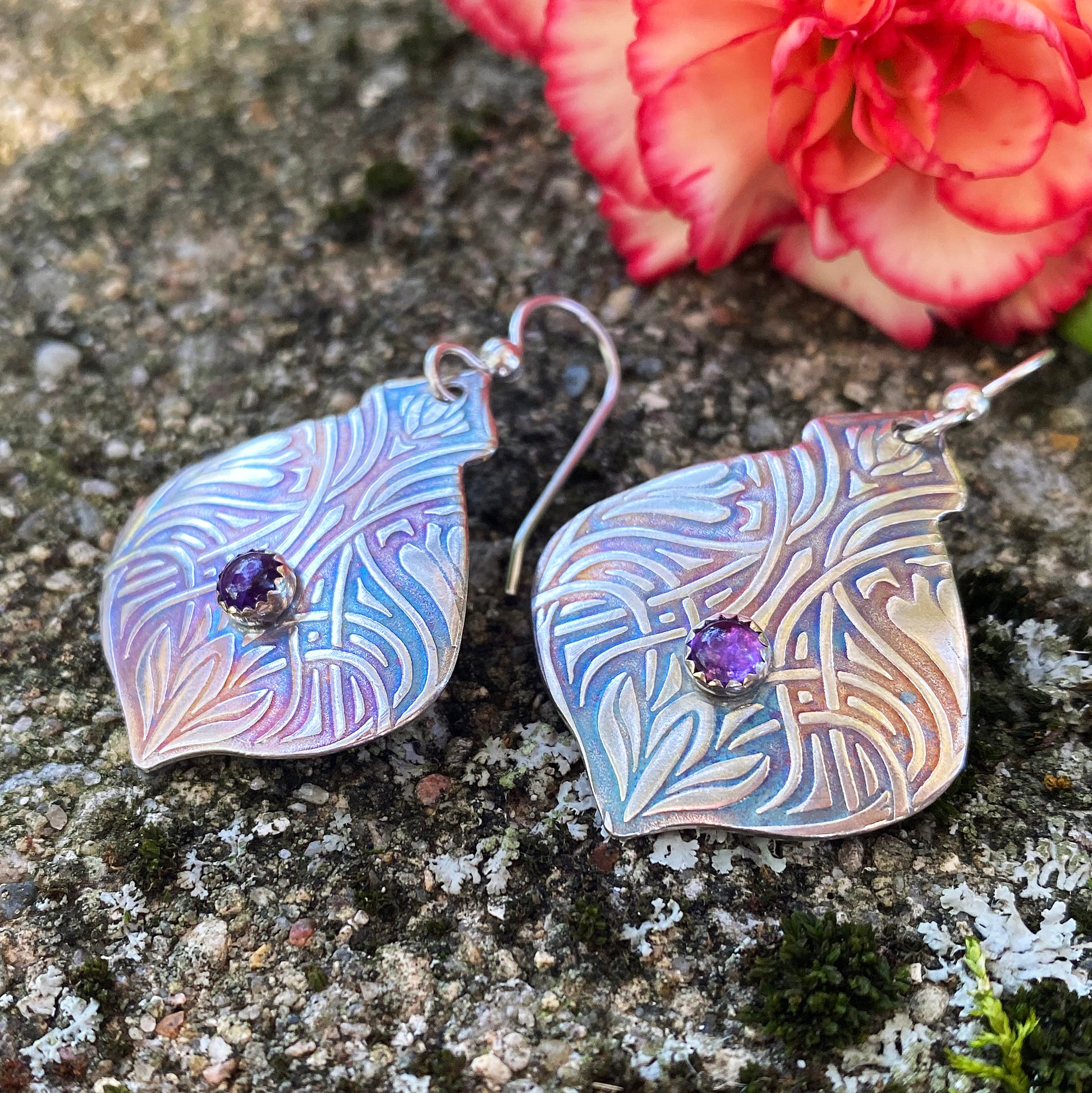 These Amethyst Twinning Flower Earrings will bloom with beauty and style! Crafted from Argentium sterling silver and each set with a 4mm amethyst, they sparkle and shine in the light. We add a hand rubbed patina to show off all the delightful details, making these the perfect earrings for any flower! Sterling silver ear wires. Earrings are 1" wide and 1 1/4" long.