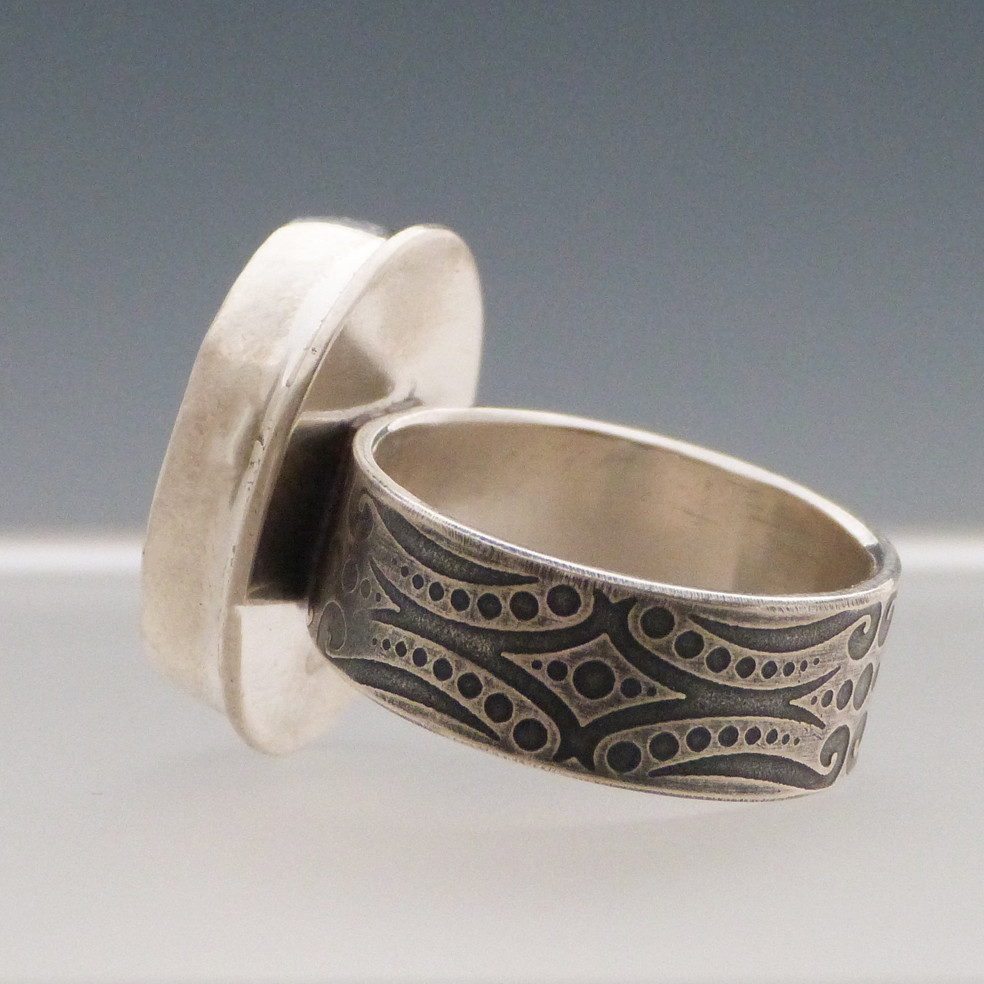 This unique and dazzling Turquoise Gemstone Ring is sure to make a statement and get some heads turning! Handcrafted with a bright blue turquoise gemstone, and set in a fine silver bezel. The band is roll printed with a hand-rubbed patina, and made with Argentium sterling silver. Check it out and be the envy of all your friends! This ring is a size 8.5, I suggest sizing up .5 size from your typical ring size to accommodate for wide band.