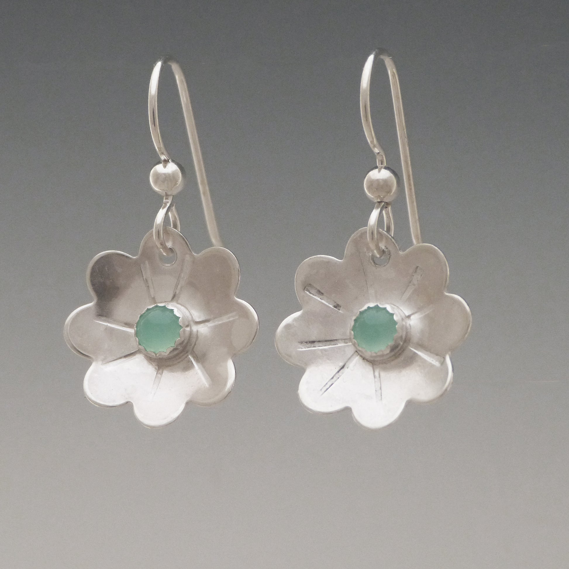 These Chrysoprase Gemstone Flower Earrings are crafted from .999 fine silver. Sterling silver ear wires. The earrings have a 4 mm stone set in the center of a flower shape. The flowers are approximately 5/8" long and 5/8" wide. These one-of-a-kind earrings are cute and simple.