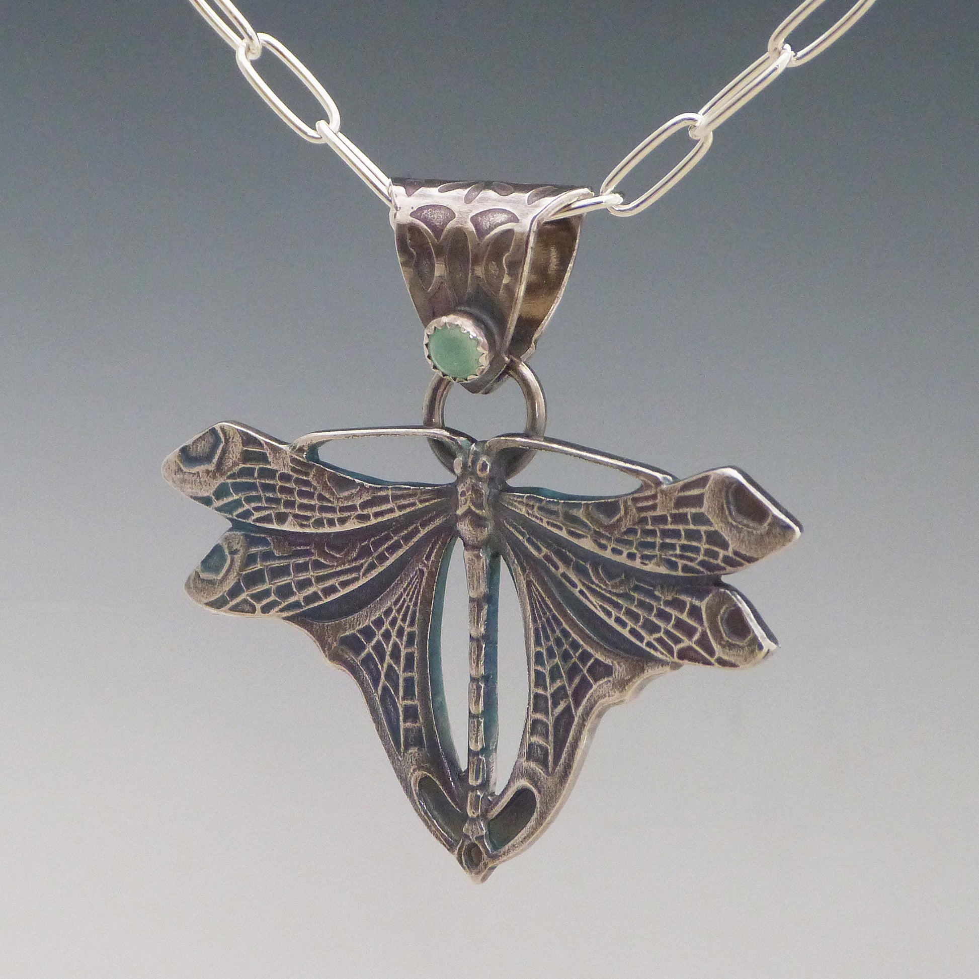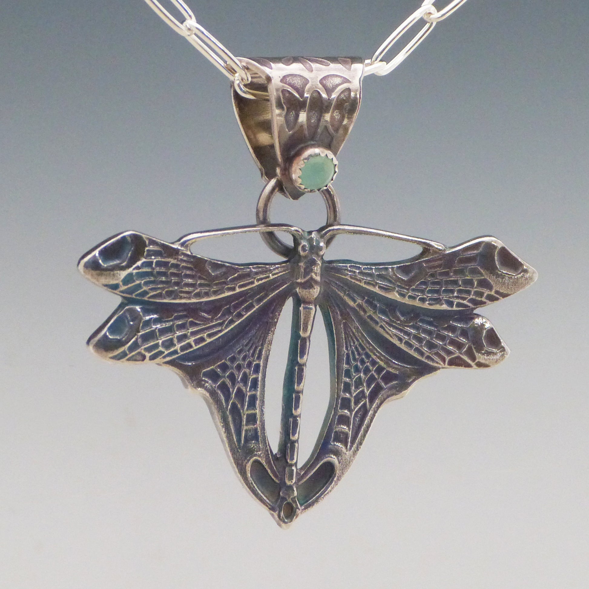 This Chrysoprase Mayfly Pendant is an exquisite display of flying grace. Handcrafted with fine silver and Argentium sterling silver, the pendant is adorned with a 4mm Chrysoprase stone. A subtle patina was used to bring out the mayfly's gorgeous details. Spread your wings and soar! Be sure to identify sterling silver oval link chain length.