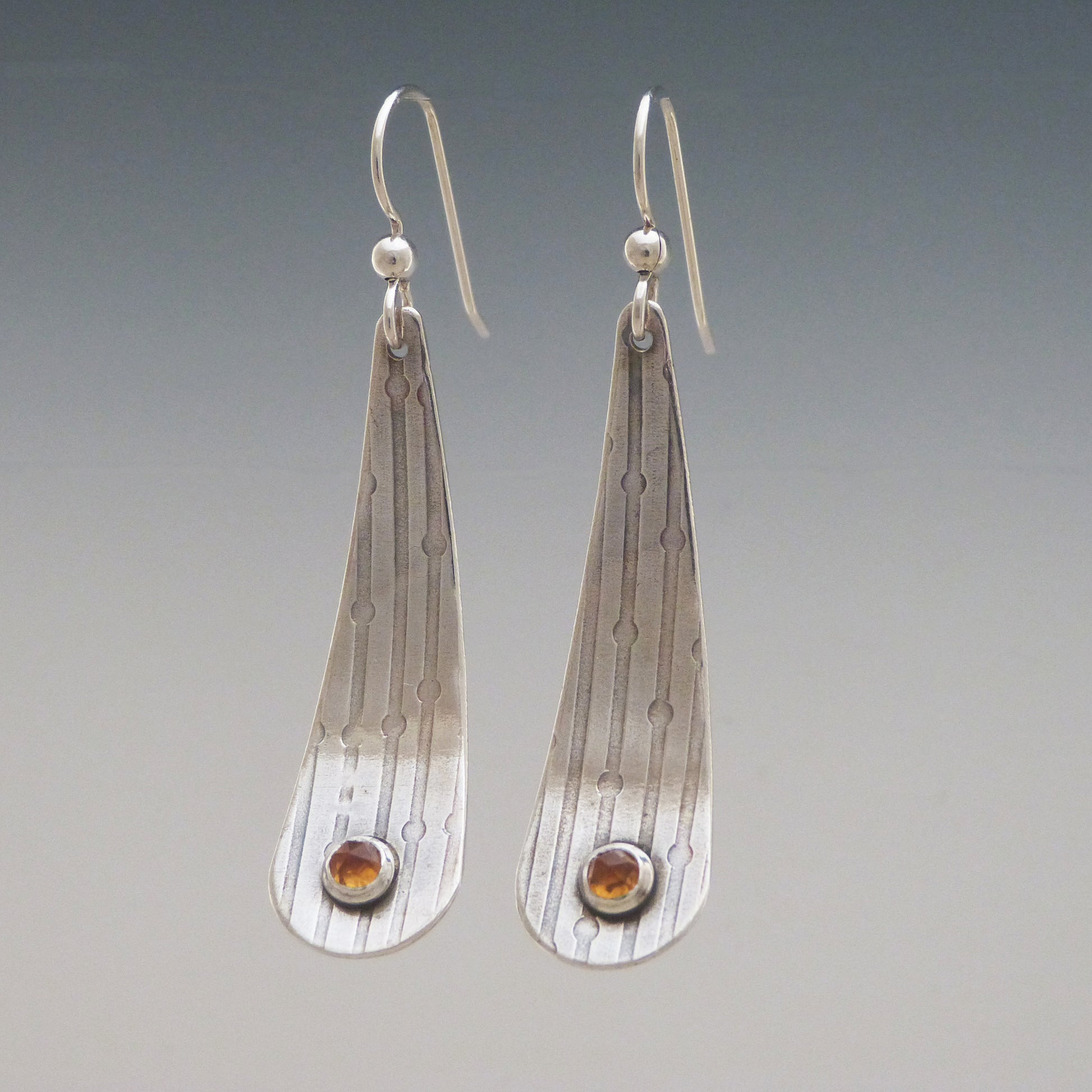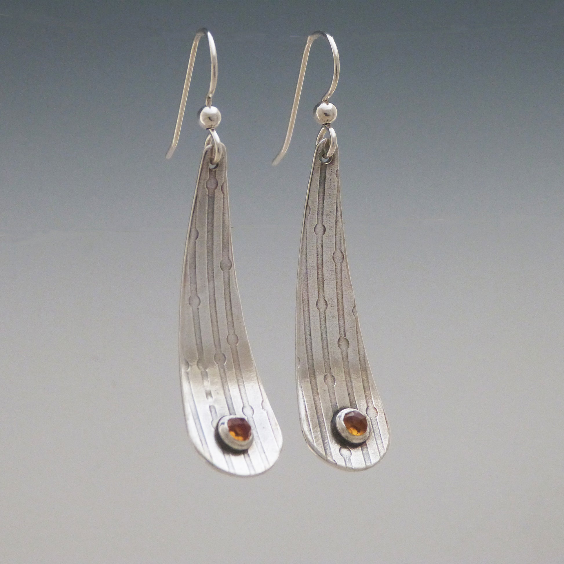 These Citrine Drop Earrings are one of a kind. They are crafted using Argentium silver and have sterling silver ear wires. A 4 mm rose cut faceted citrine stone sets in the lower center of these drop earrings. The earrings are approx. 1 & 5/8" long and 1/2" wide at its widest point.