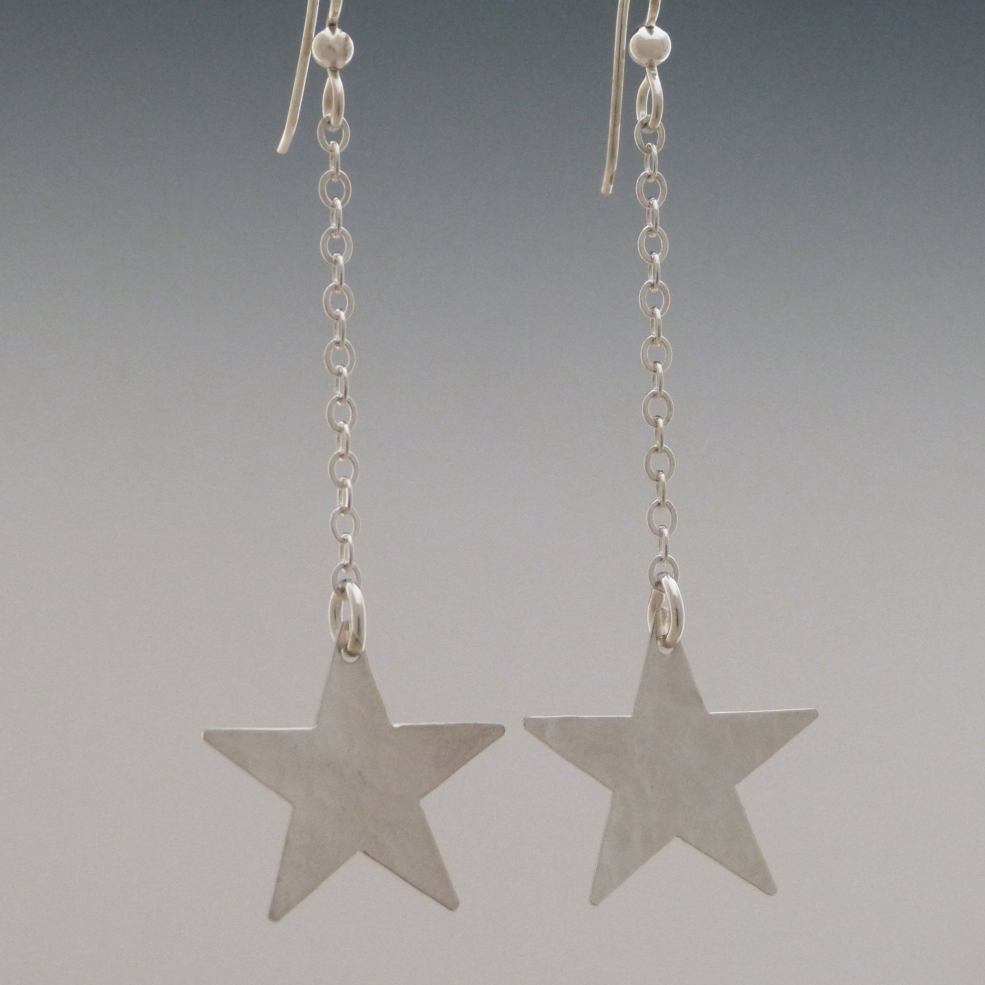 These simple, yet adorable Swinging Star Earrings are hand crafted using sterling silver. There is a slight hammered texture on each star, and a long dangling chain. Sterling silver ear wires. Each earring measures just over 2" long.
