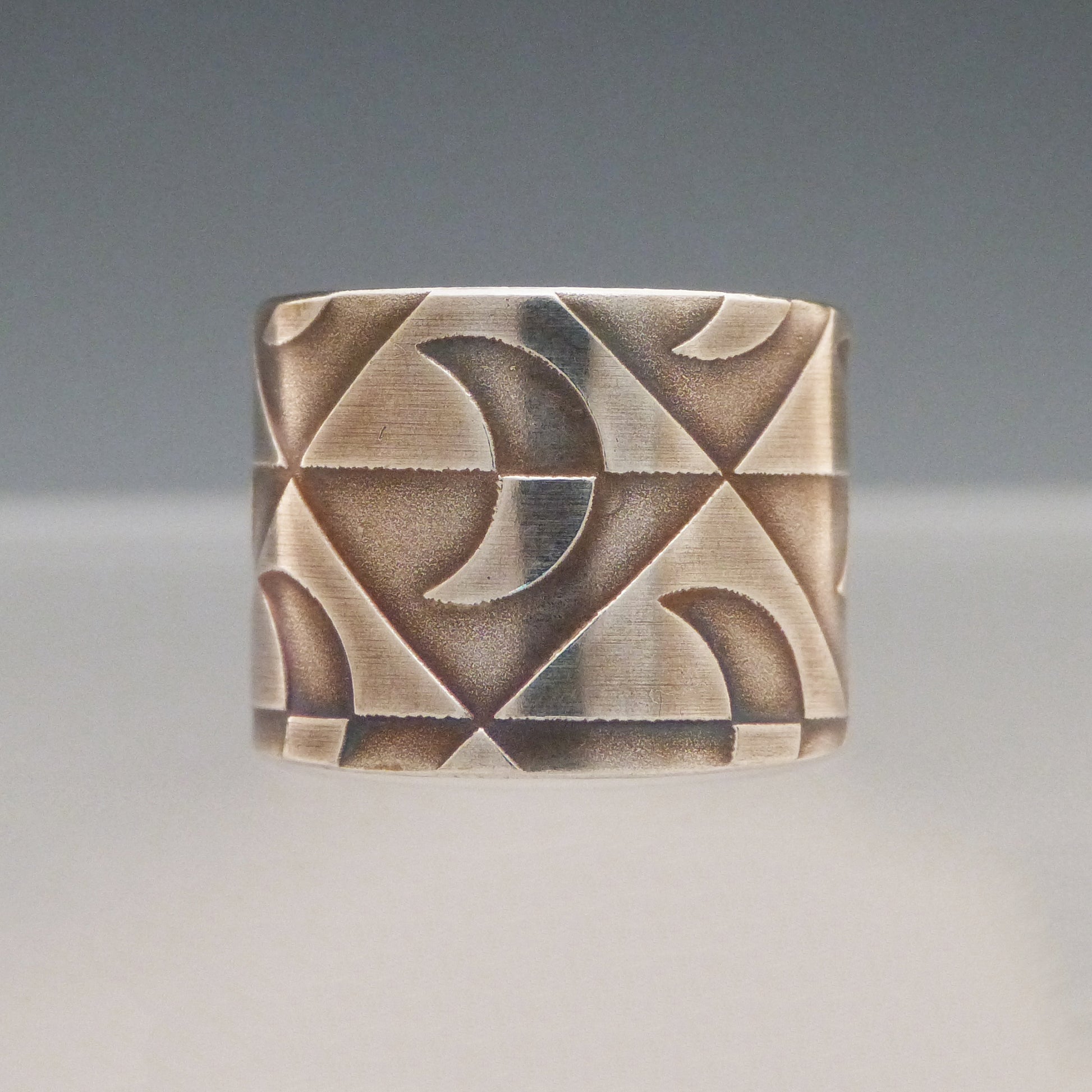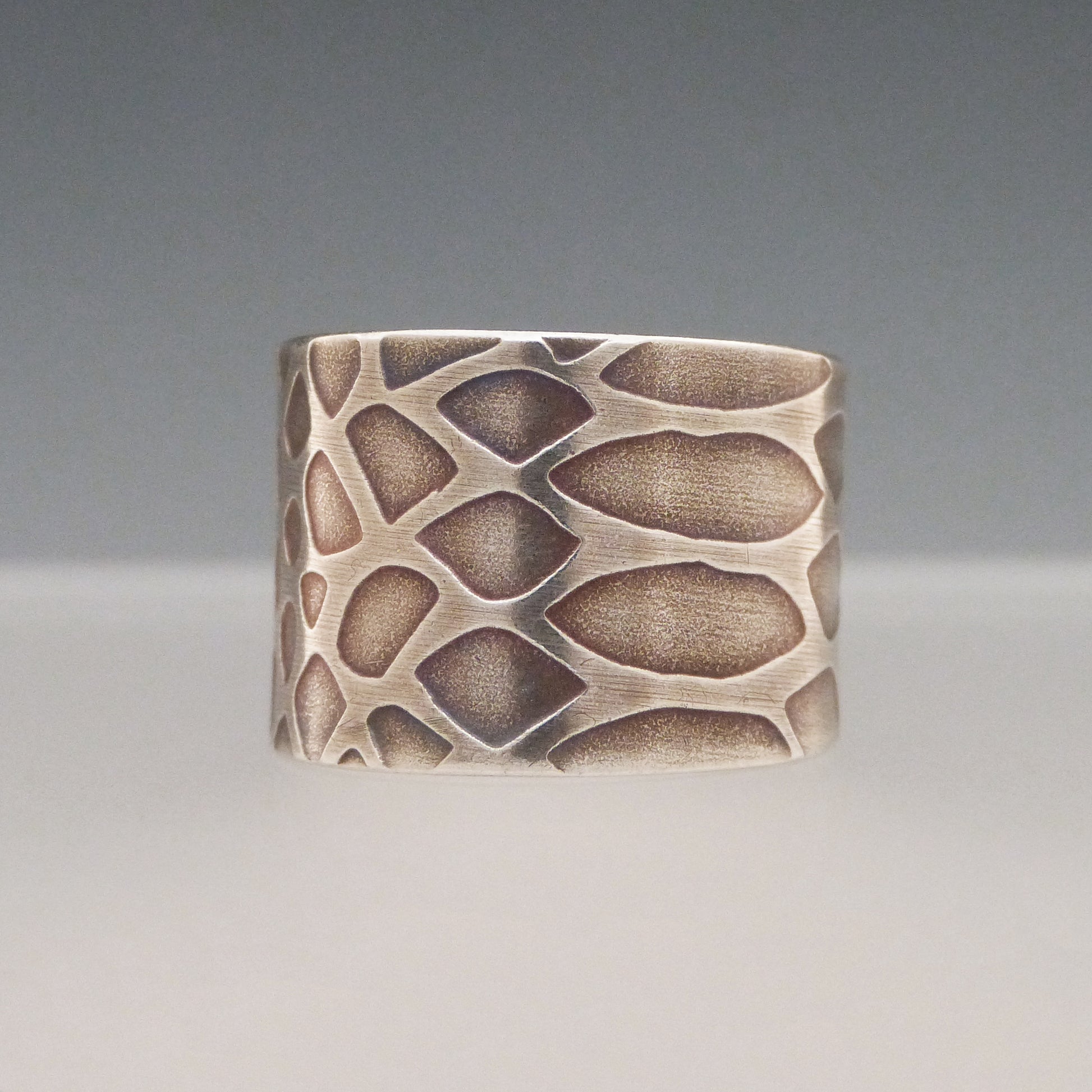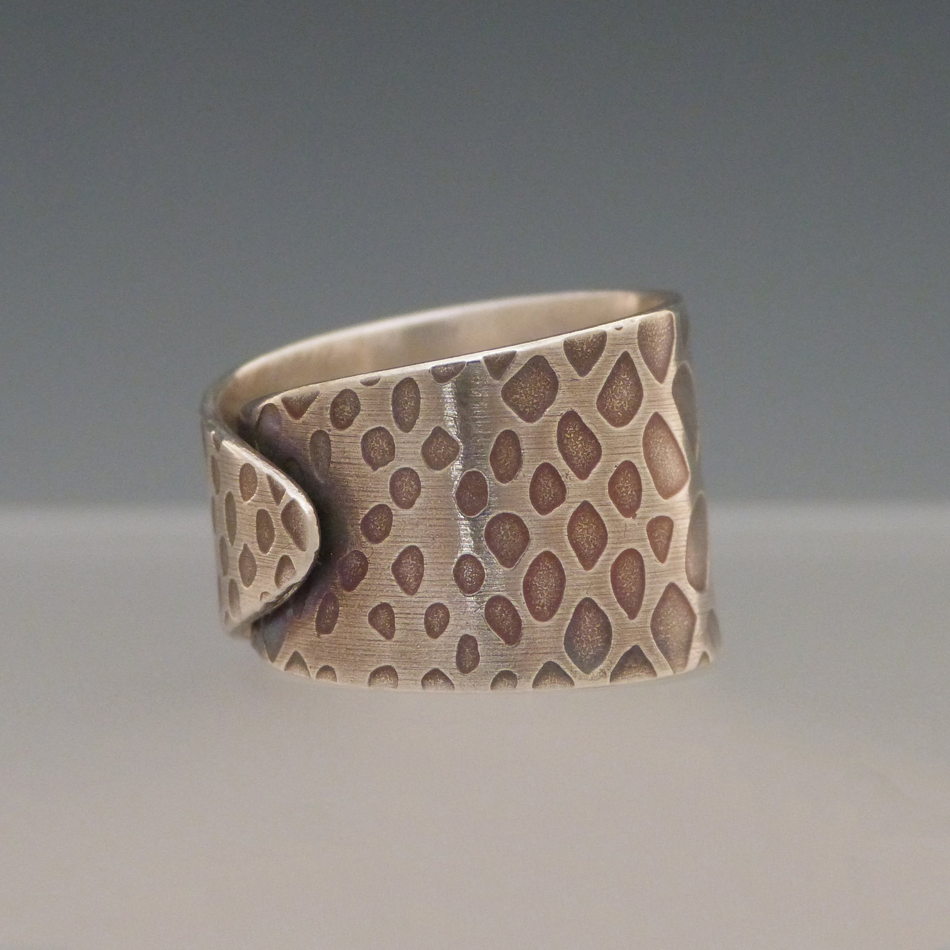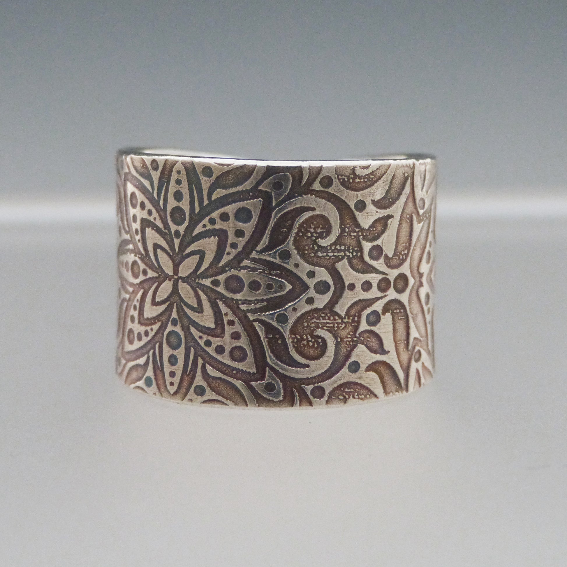 These Customizable Sterling Wrap Rings are tarnish resistant Argentium silver. Roller printed patterned designs are used to create unique, handcrafted rings. A hand rubbed patina emphasizes all the intricate details. Widest part of the band is approx. 5/8" long. Each design may differ slightly per ring. Indicate design before purchasing, message artisan for specific ring size. Sizes available 5-11.