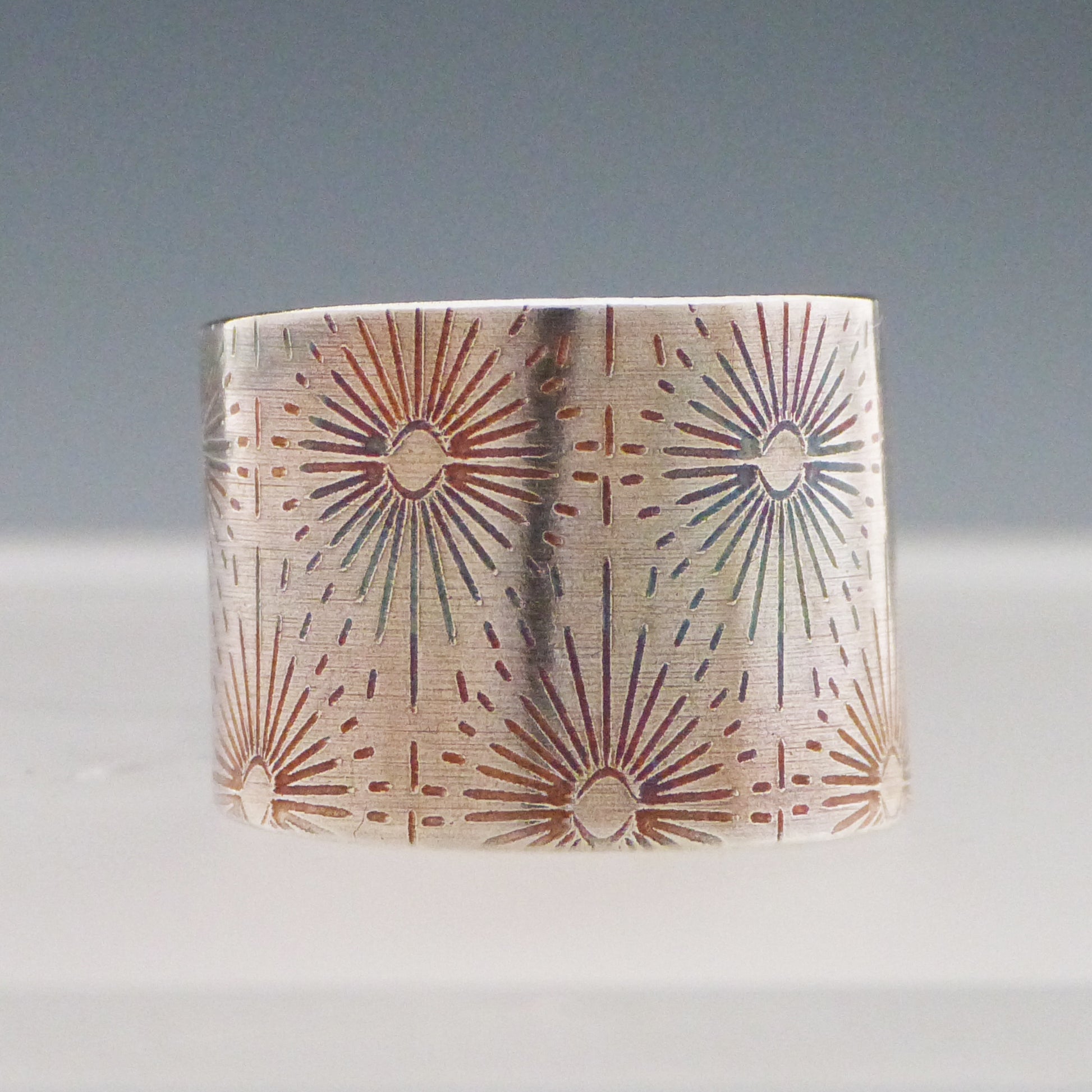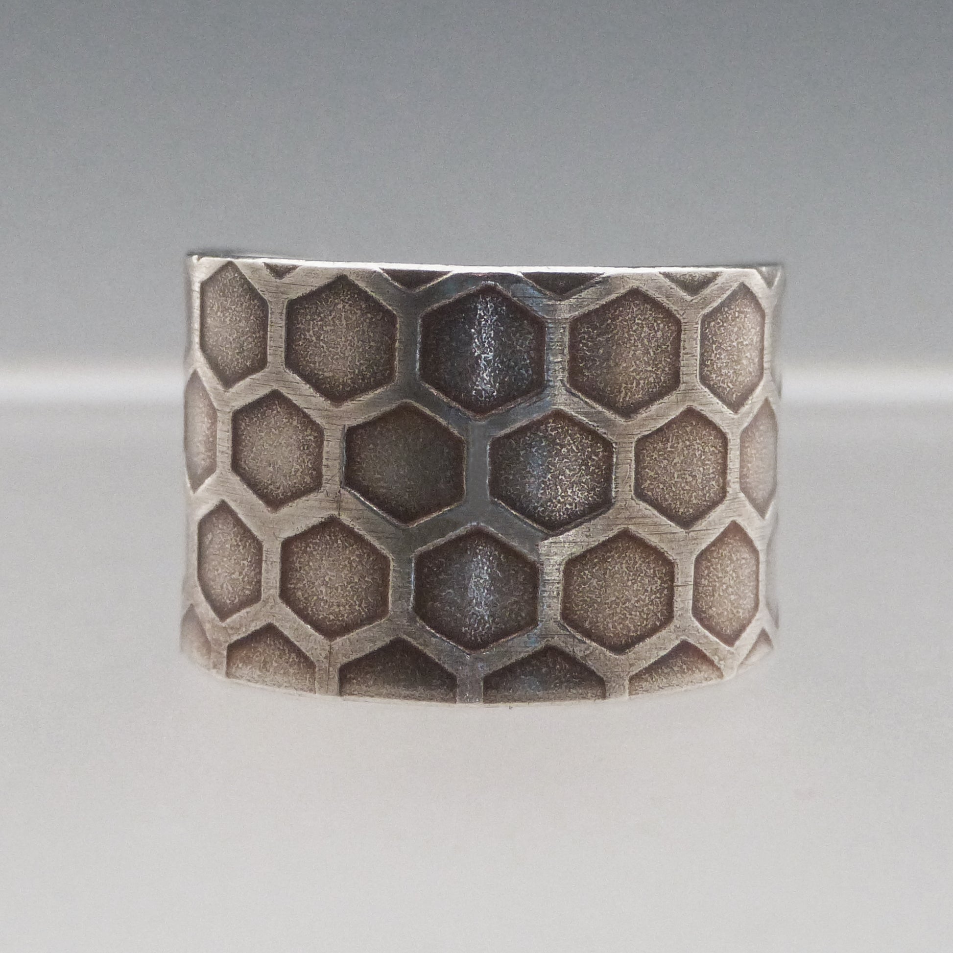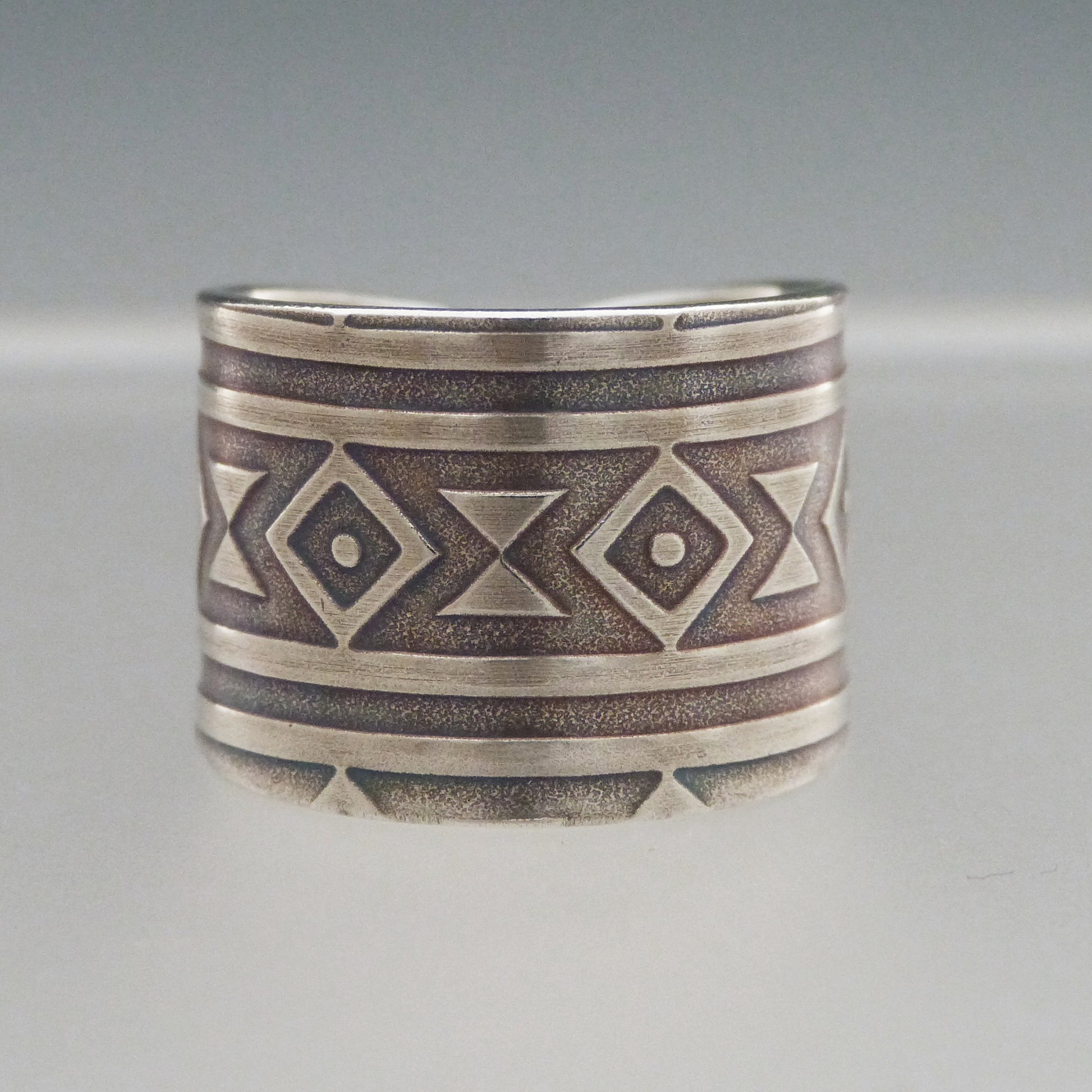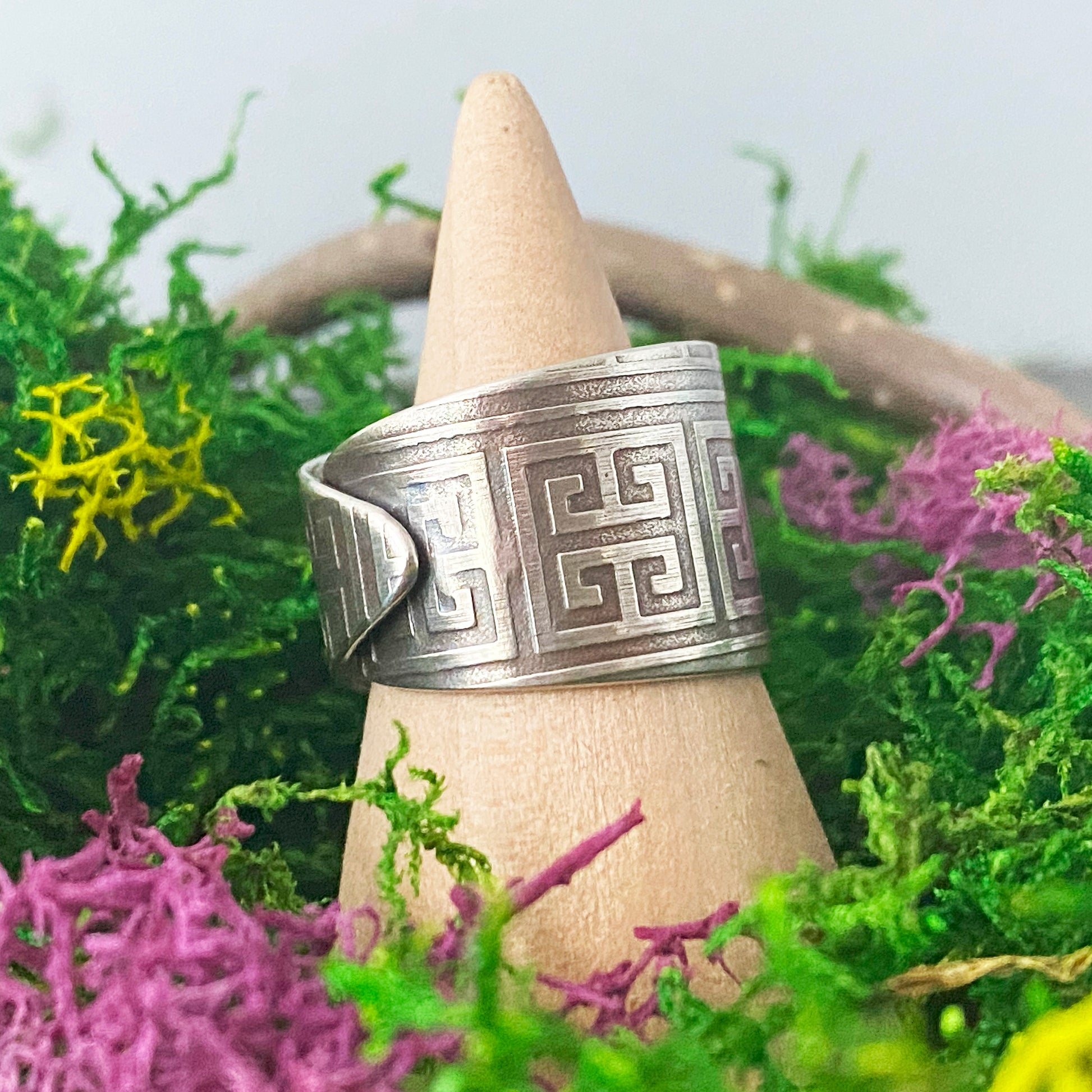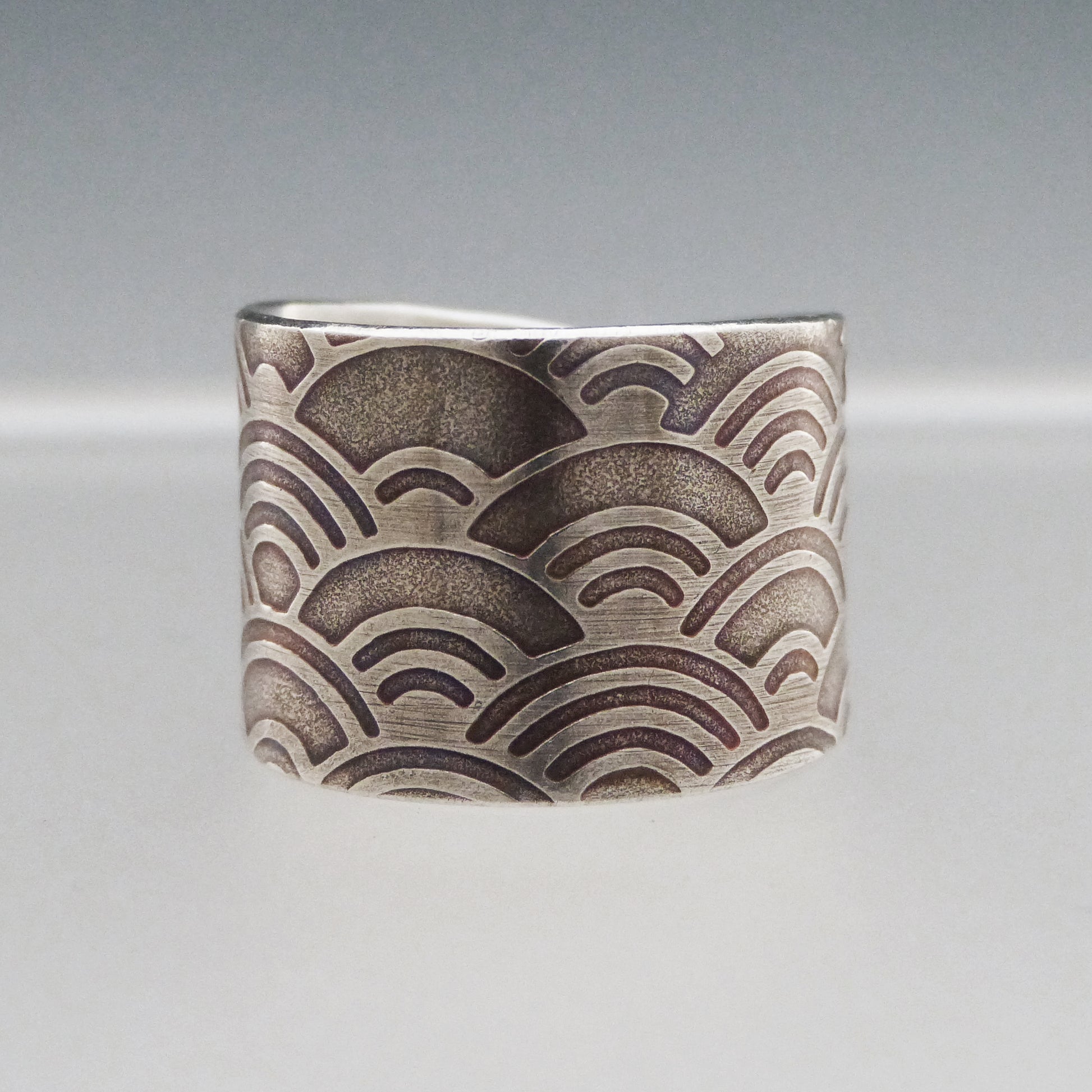 These Customizable Sterling Wrap Rings are tarnish resistant Argentium silver. Roller printed patterned designs are used to create unique, handcrafted rings. A hand rubbed patina emphasizes all the intricate details. Widest part of the band is approx. 5/8" long. Each design may differ slightly per ring. Indicate design before purchasing, message artisan for specific ring size. Sizes available 5-11.