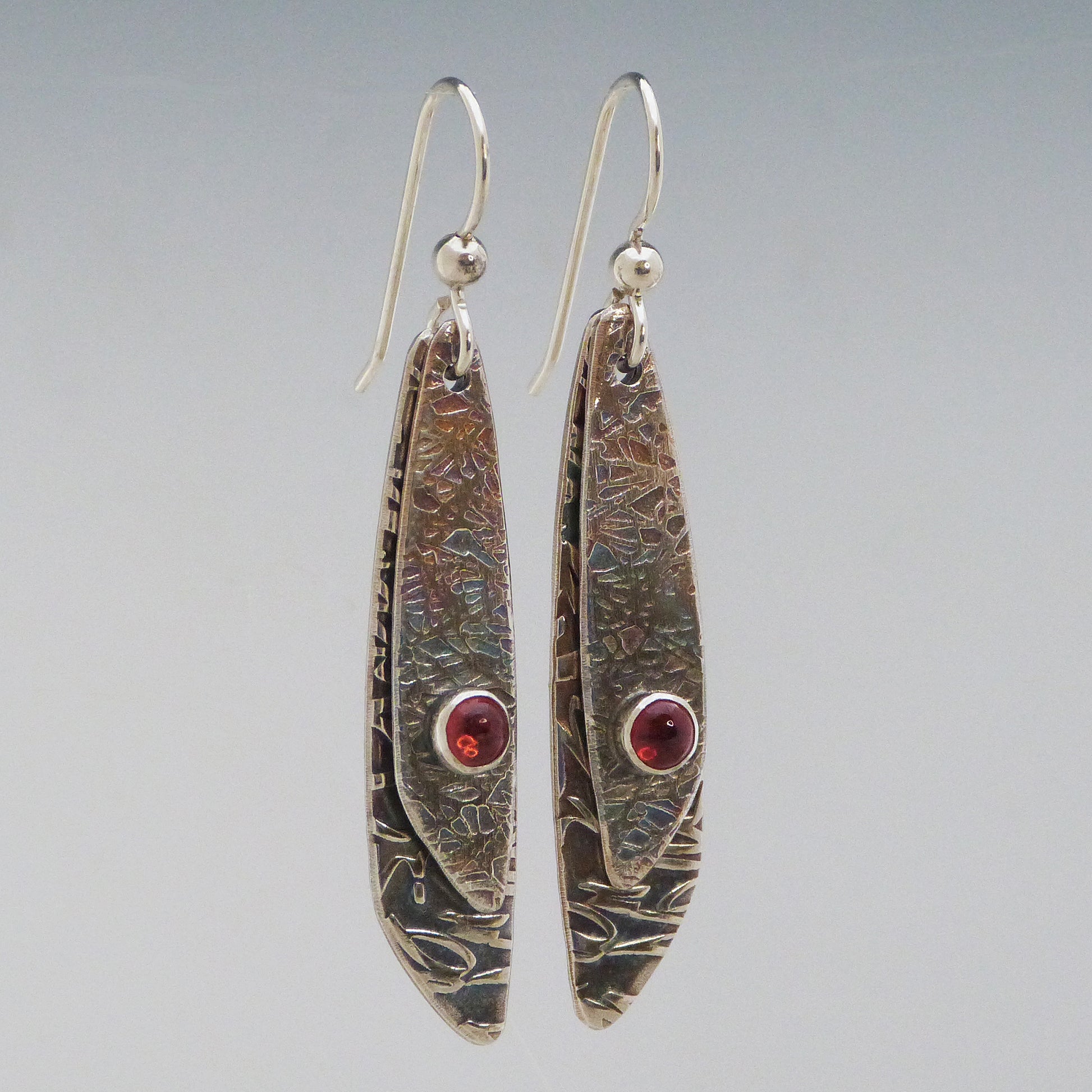 Treat yourself to something special with these dazzling Double Drop Garnet Earrings! Featuring two separate roll printed designs and two stunning 4mm garnets, these long earrings are crafted with Argentium sterling silver and have sterling silver ear wires. So don't be shy, drop in and double drop your style game! Earrings are 1 & 1/2" long and approx. 3/8" at its widest point.