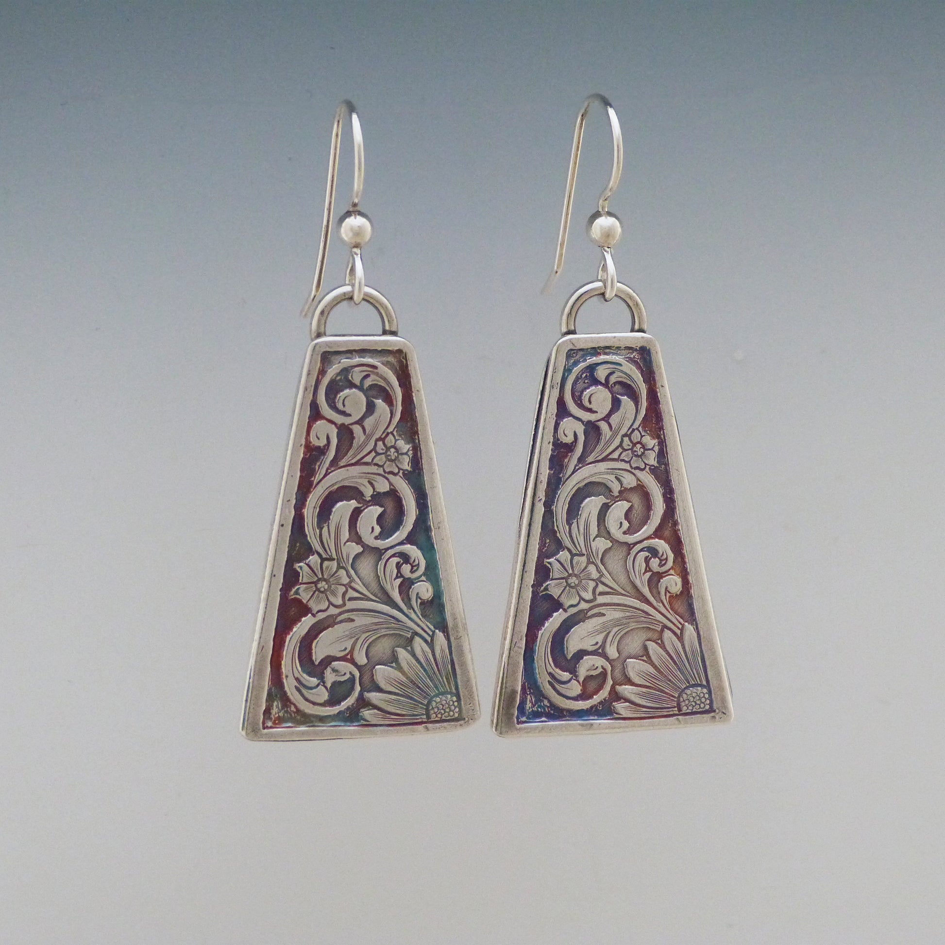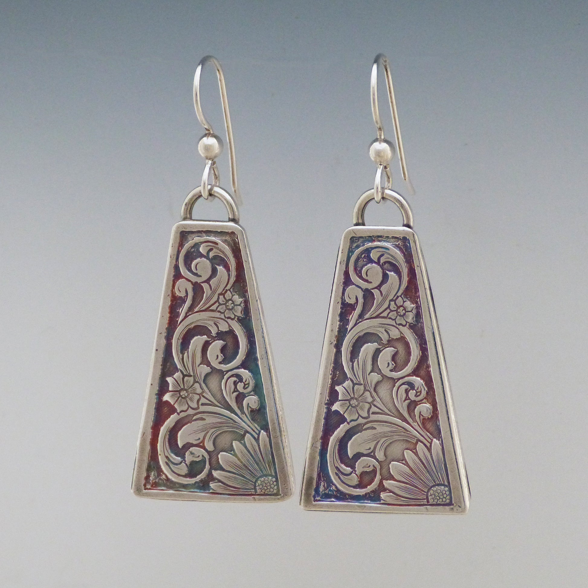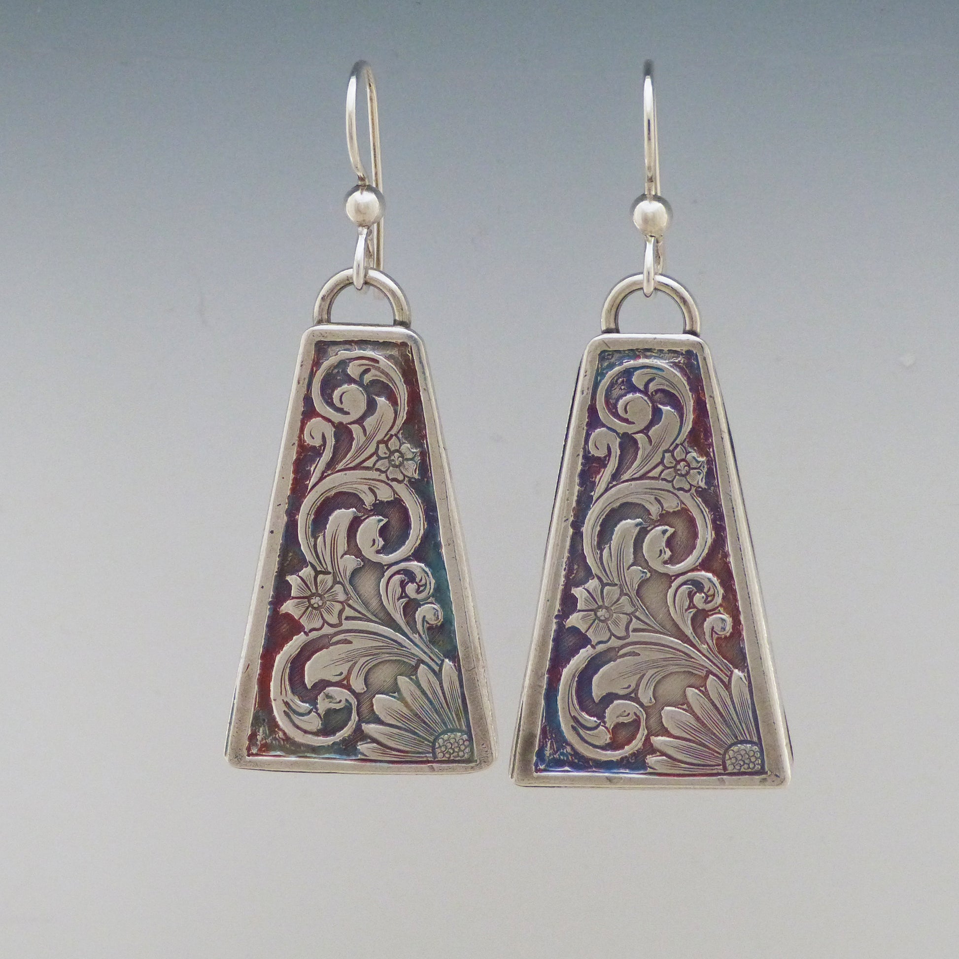 These gorgeous Euclidian Garden Earrings are lovingly crafted with .999 fine silver. Sterling silver ear wires 'ear-mark' this style for exquisite vibes! A hand-rubbed patina accents all the intricate details. Earrings are 4/5" at their widest point and 1 1/4" long.