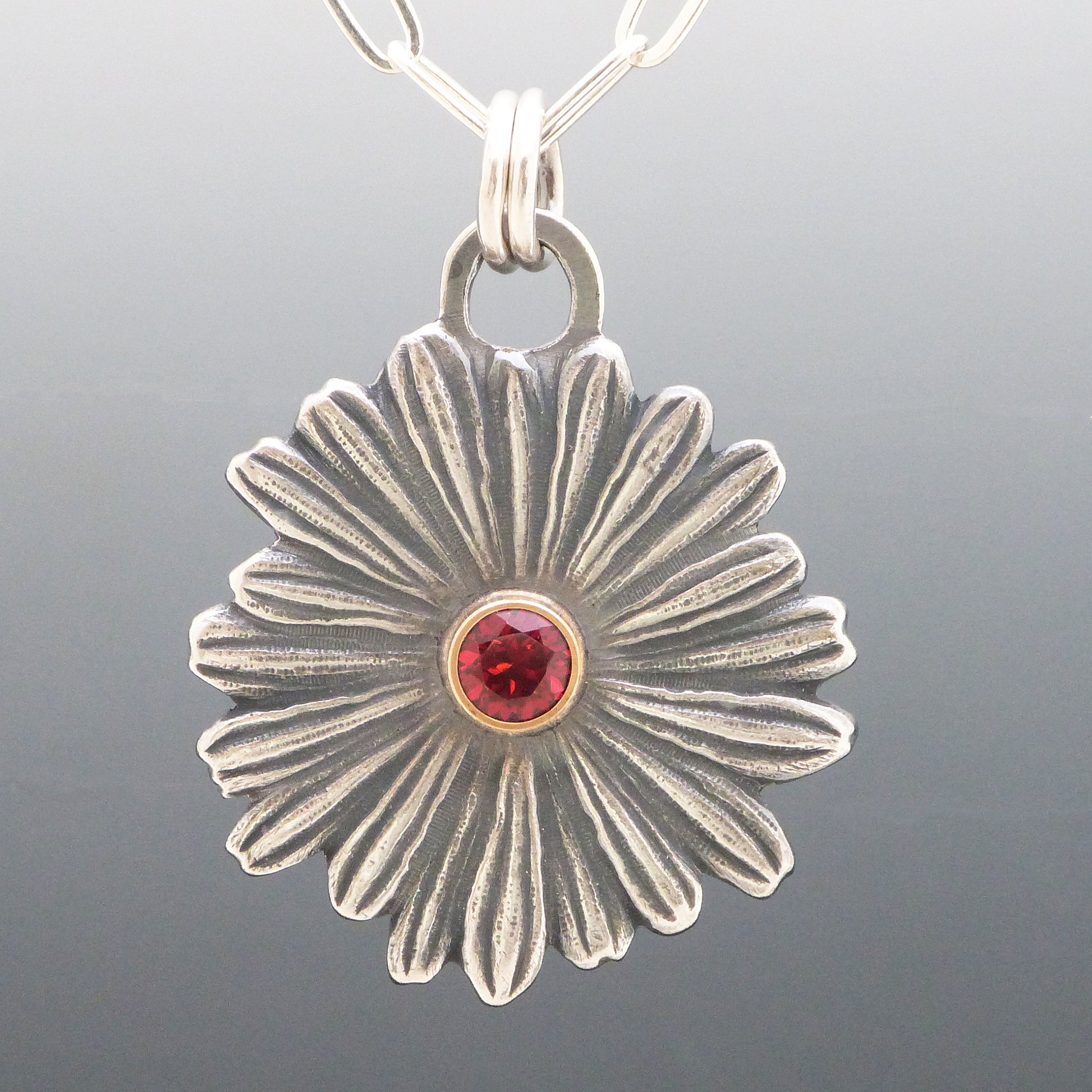This stunning Garnet Daisy Necklace will have you feeling daisy fresh! Crafted from .999 fine silver and a 18k gold bezel, it's the perfect flowery accessory for any occasion. Elegant yet playful, this 5mm faceted Garnet and sterling silver chain will keep you in bloom all season long! Pendant is approximately 1" in length and width.