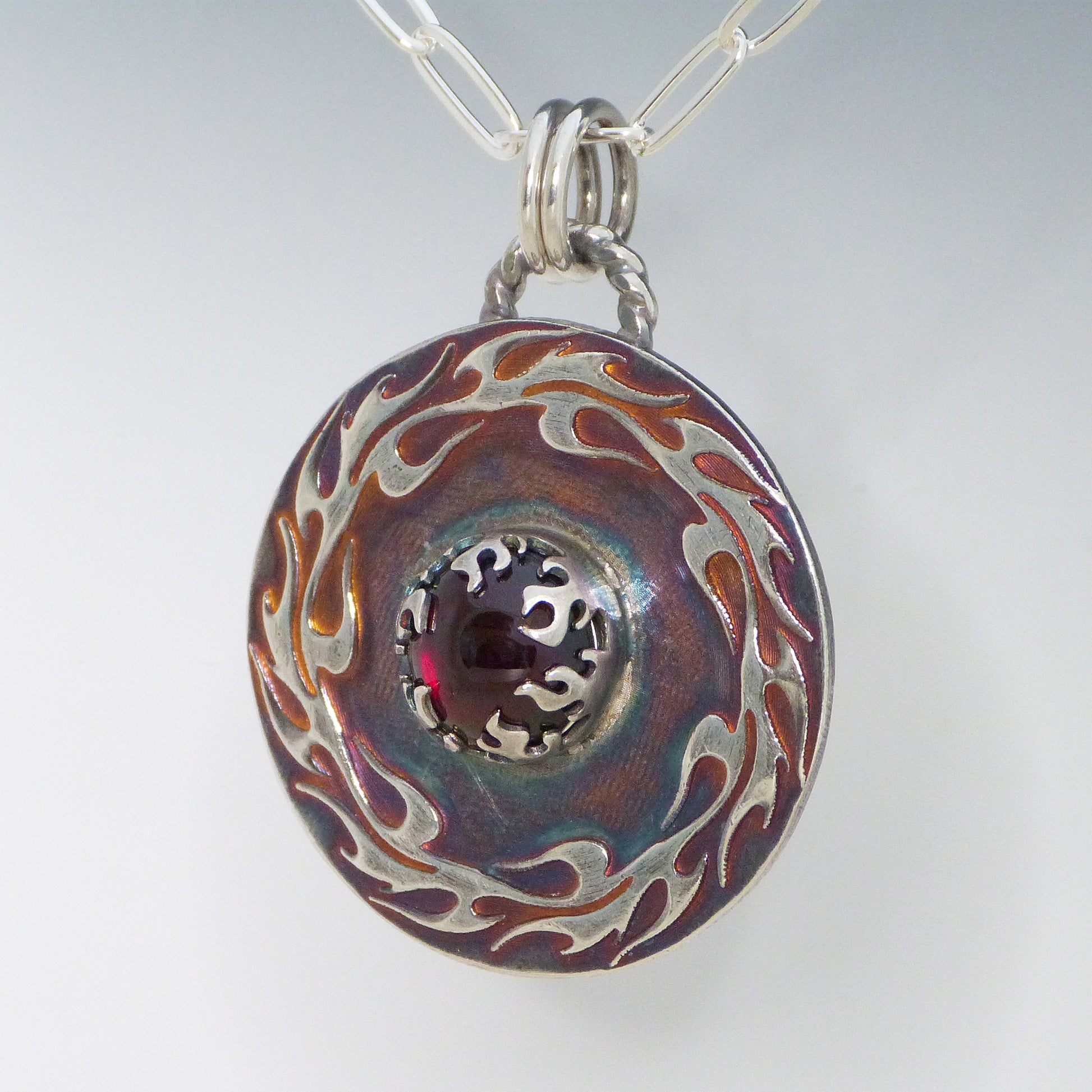 This Garnet Flame Necklace is one-of-a-kind and too hot to handle! Crafted with .999 fine silver and argentium sterling silver, this handmade necklace will set you up in style. Show off your unique, "too-cool-for-school" vibe with this unique statement piece that's sure to spark fires! A hand-crafted patina accents the beautiful flame detailing. Available with a sterling silver oval link chain. Pendant is 3 mm in length and width.