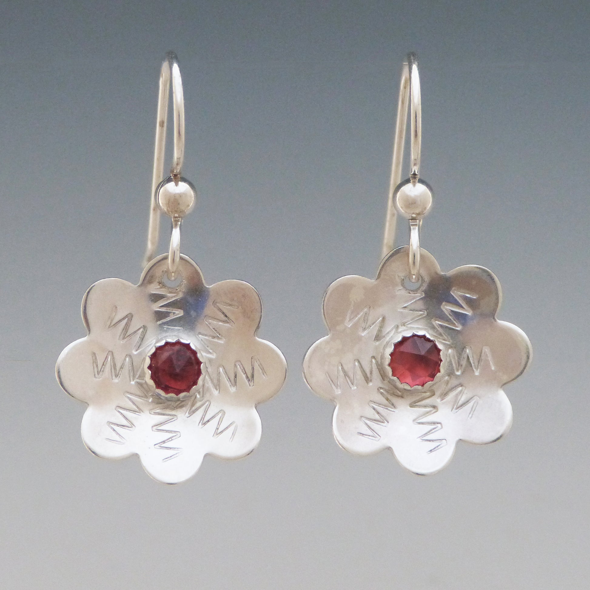 These Garnet Gemstone Flower Earrings are cute and simple. These one-of-a-kind earrings are crafted using .999 fine silver. They are set with a beautiful 4 mm faceted Garnet. Sterling silver ear wires. The flowers are approx. 5/8" wide and 5/8" long.
