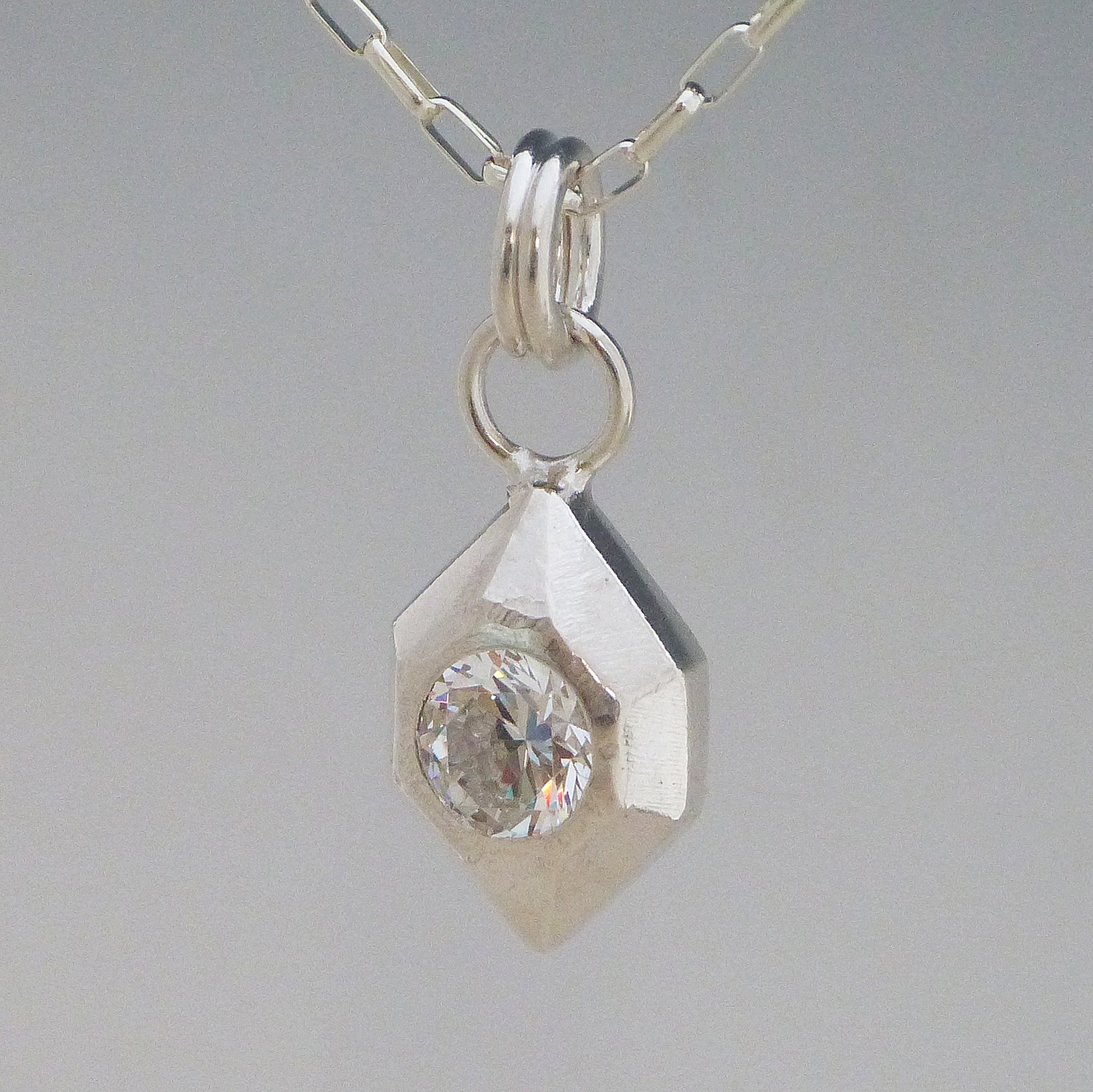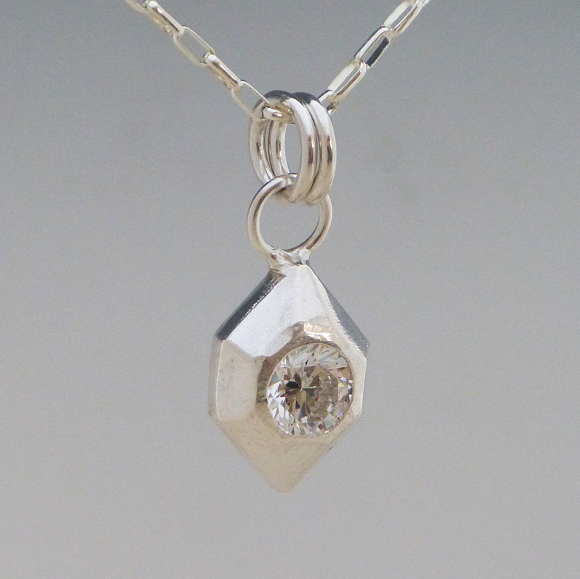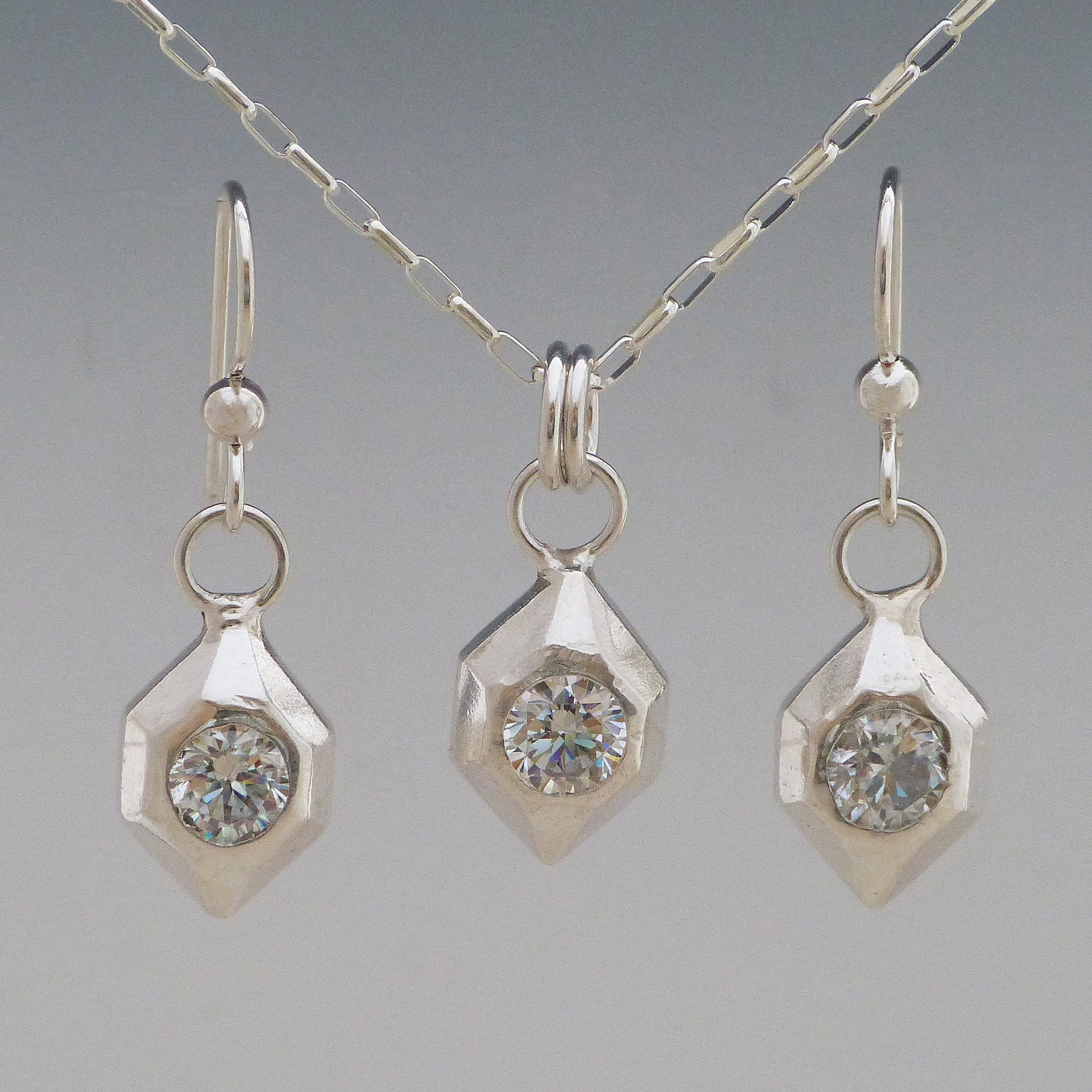 A subtle but dazzling statement made with the finest materials! This handmade Geometric Gemstone Necklace is crafted from .999 fine silver and is hammer-set with 6mm gemstones for a stylish, understated look. Perfect for adding a little sparkle to any ensemble! Please identify chain length and stone type. (Edit: Cubic Zirconia has earring set available)