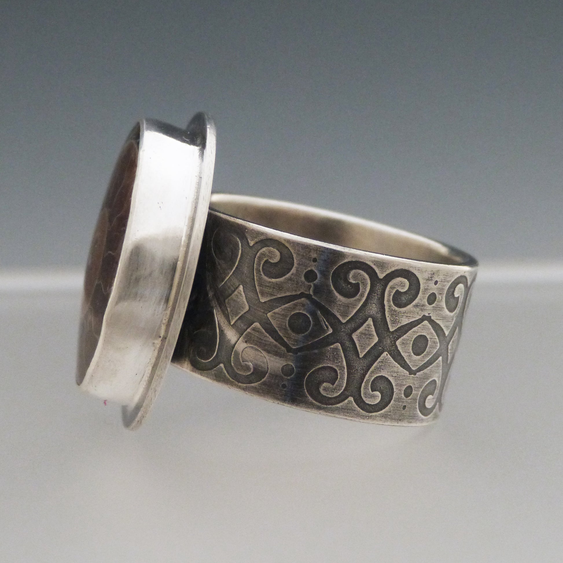 This is a stunning Gobi Turquoise Gemstone Ring. Crafted using tarnish resistant Argentium silver with a .999 fine silver bezel. A unique patterned band adds a detailed touch to the ring. Ring is size 9. A stunning oval shaped Gobi Turquoise sets in the center of this ring. Ring band is approx. 1/3" wide.