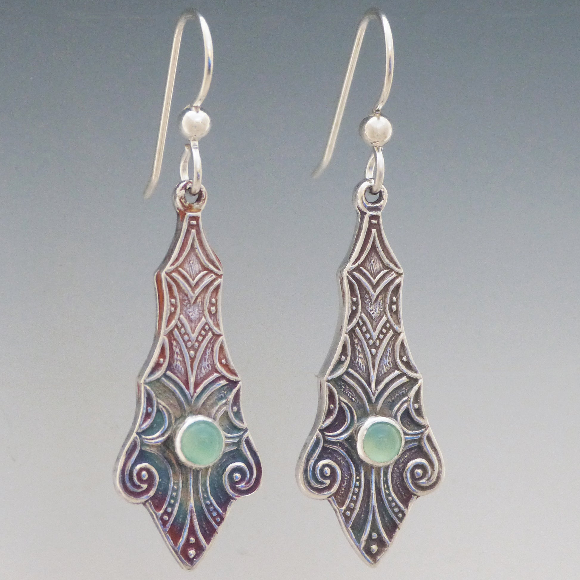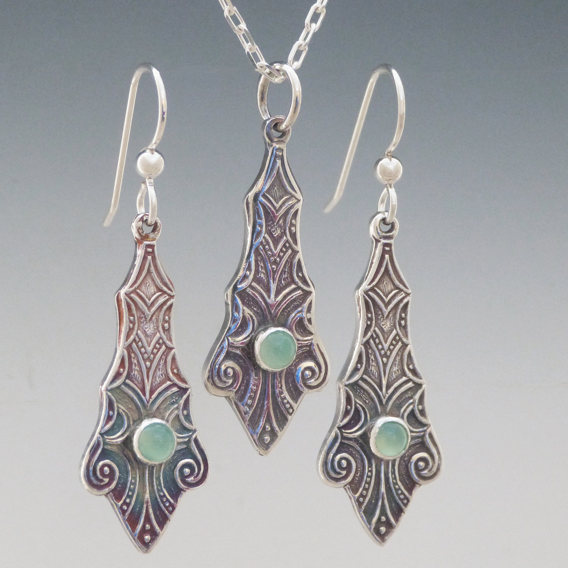This Green Chrysoprase Art Nouveau Earrings are crafted using .999 fine silver. Sterling silver ear wires. Set with beautiful 4 mm green Chrysoprase stones surrounded by a unique art nouveau design. These earrings measure approx. 1 1/4" long and 1/2 wide. A matching necklace is available to complete this stunning set.