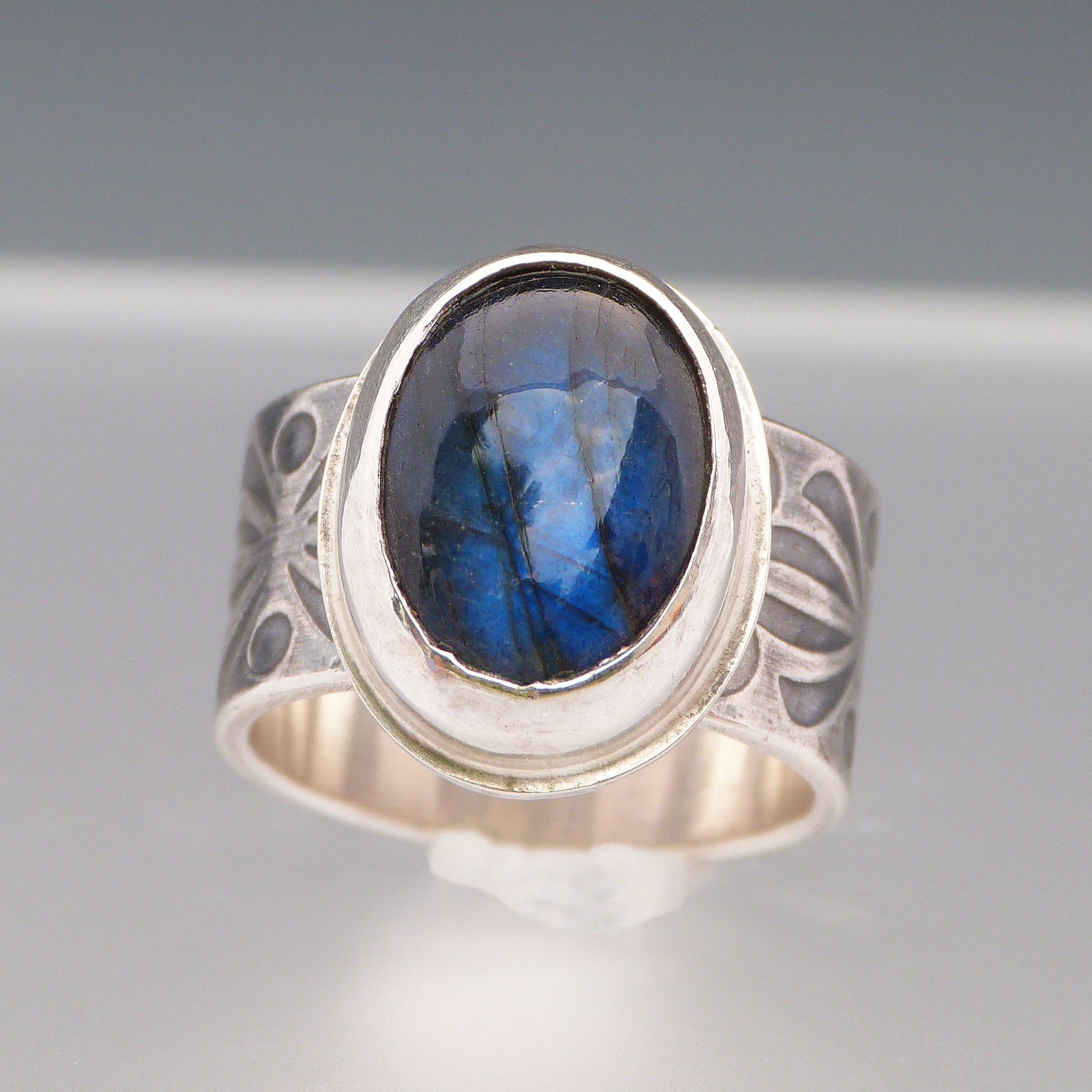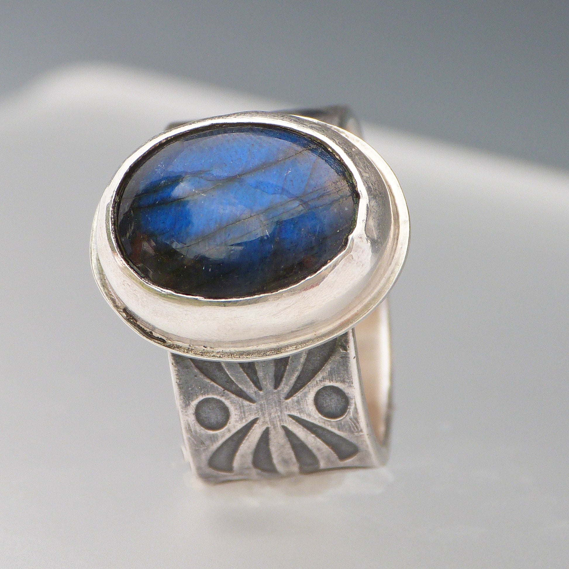 This unique Labradorite Gemstone Ring is handcrafted using Argentium sterling silver with a .999 fine silver bezel. Ring is size 7. A unique roller printed band adds gorgeous detail to this piece. Stunning dark blue Labradorite sets as the centerpiece. Band width is approx. 1/3" wide.