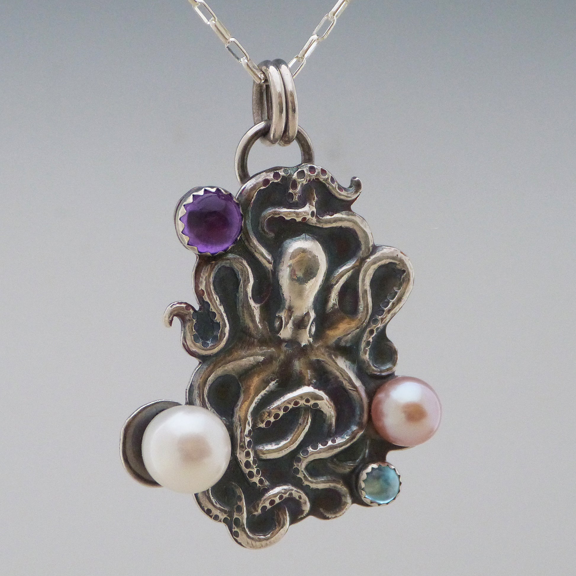 It's not just a pendant, it's a work of art! Make a splash with this stunning handmade Octopus Pendant, crafted from .999 fine silver and Argentium sterling silver and adorned with beautiful peach and white Freshwater Pearls, Amethyst, and 4mm sky blue Topaz. The cherry on top? Its sleek black patina. Octojewelry—it's outta this world!