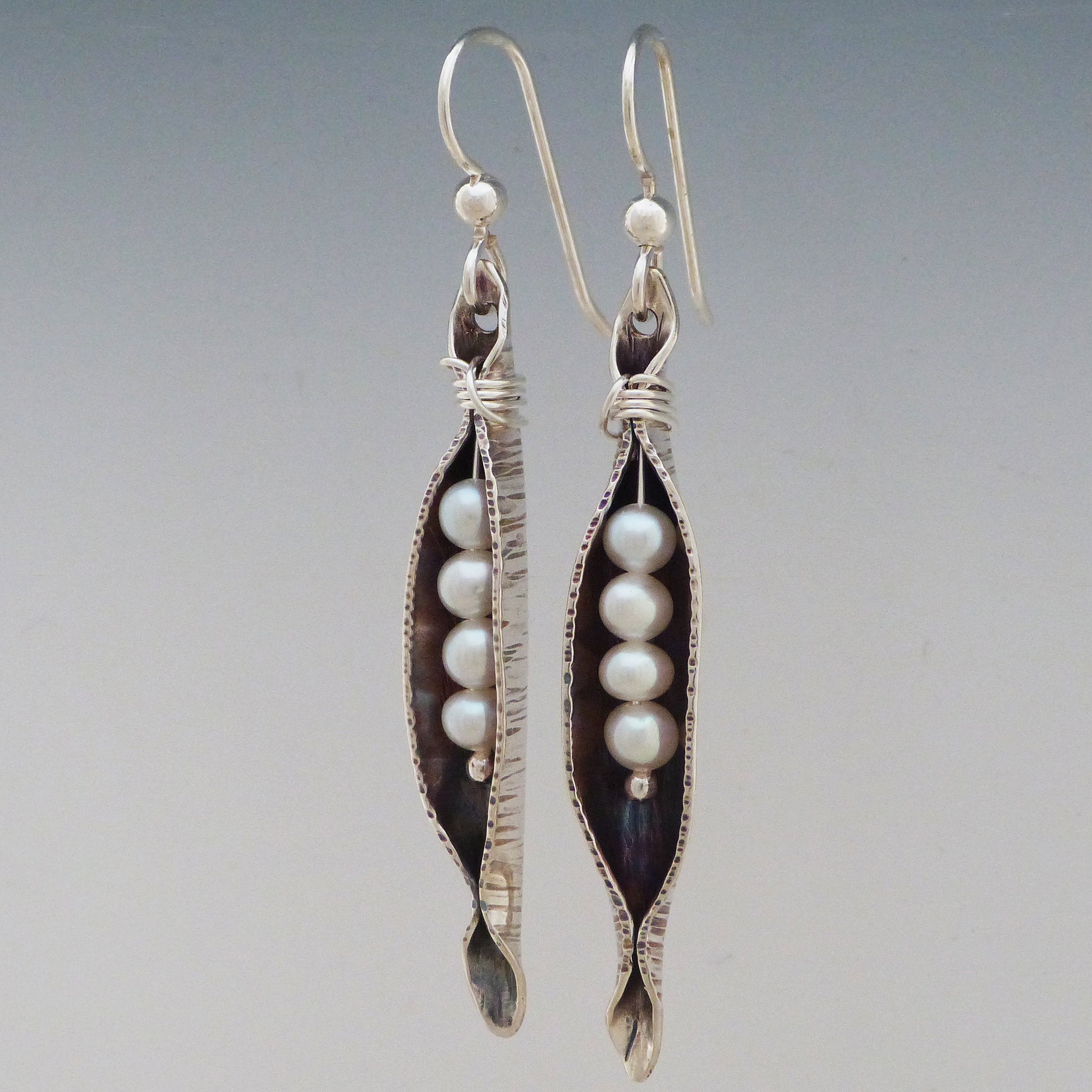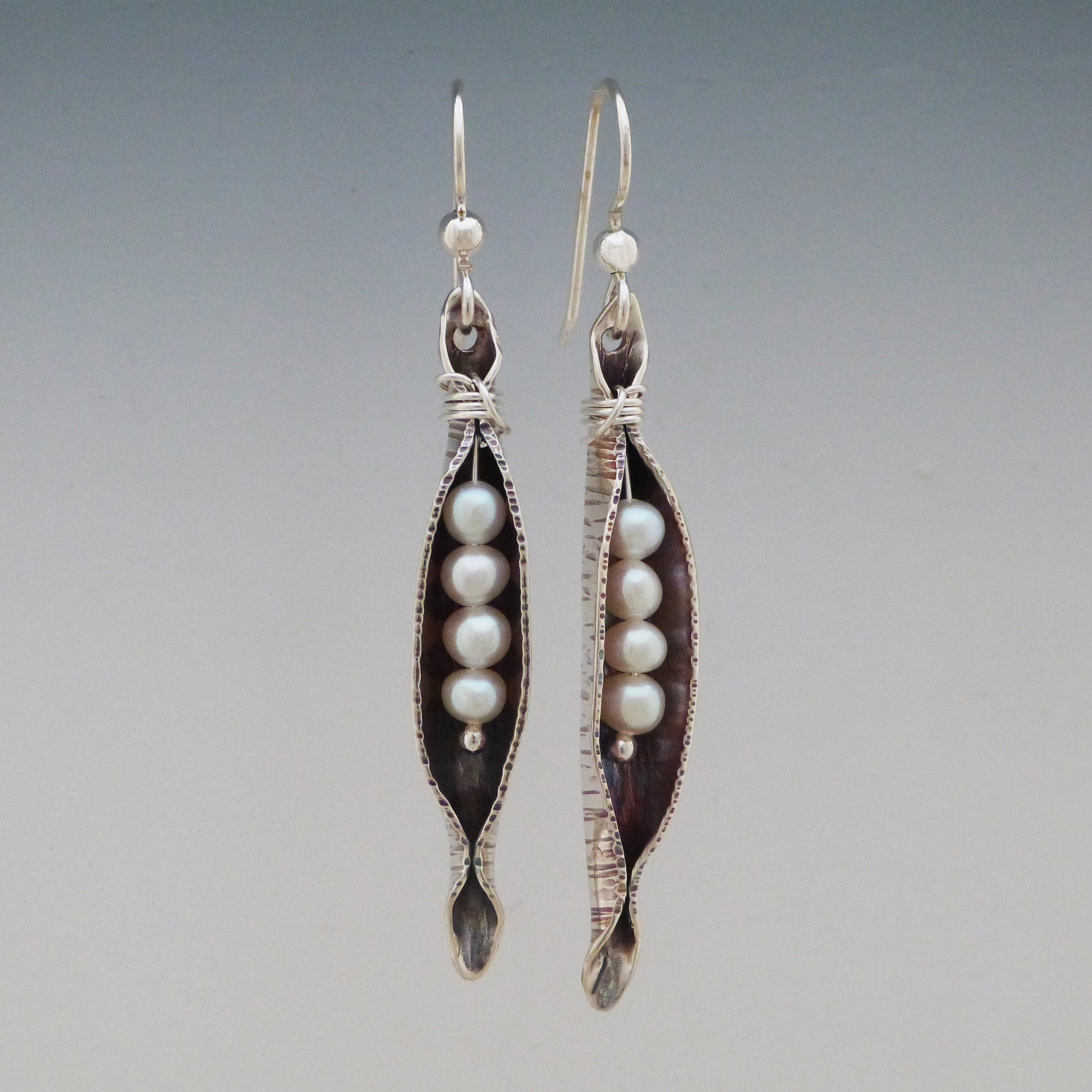 Sweet little Peapod Earrings forged from Argentium tarnish resistant sterling silver. A delicately hammer textured edge and patterned back add interest to this lovely combination of freshwater pearls and silver. The white freshwater pearls are secured with a silver wrap and nestled in a dark iridescent patina to bring out their luster. This specific pair includes 4 pearls.