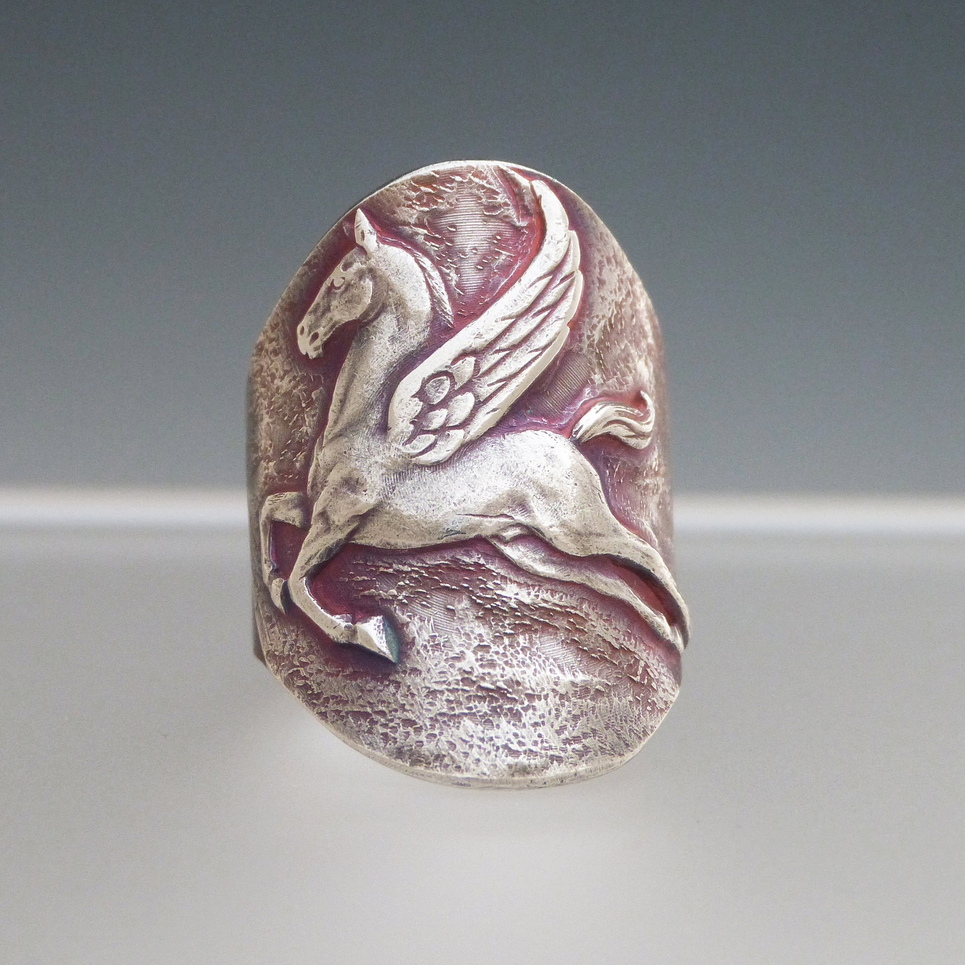 This large Pegasus Saddle Ring is a size 8 1/2. It is crafted using fine .999 silver. A hand rubbed patina brings out all the details in this unique design. This saddle ring was made by pressing fine silver into an antique die. This is a fun and stunning statement piece. This ring measures approx. 1 1/4" at the top and 3/8" on the bottom.
