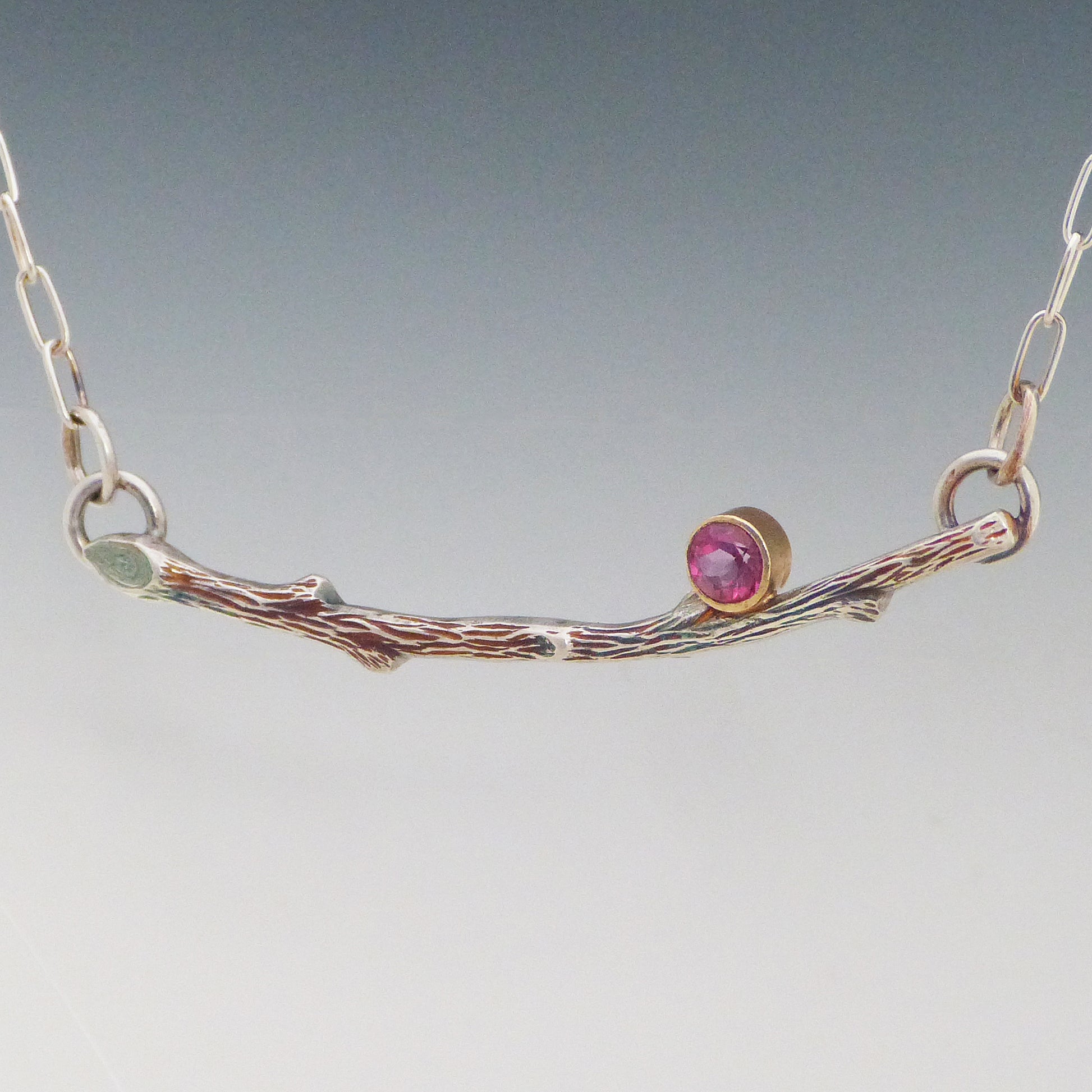 This gorgeous Pink Topaz Twig Necklace is a sight to behold! Handcrafted with Argentium sterling silver, an exquisite 5mm pink Topaz, and a 22k gold bezel setting, it's a statement piece perfect for any special occasion. And, with its carefully applied patina, it'll stand the test of time! Shine like the star you are with this shimmering handmade necklace! Pendant is approximately 1 1/2" long. Attached is an 18" oval link chain.