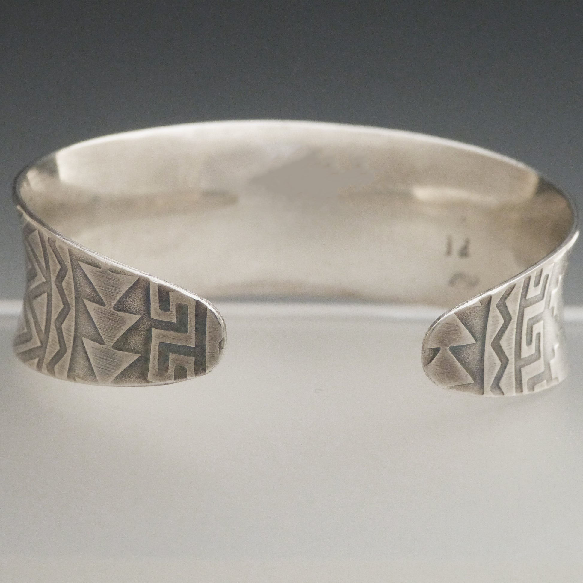 Rock the Southwest scene with this sterling silver one-of-a-kind patterned cuff! Its anticlastic shape and adjustable size - from 6.5" to 7.5" wrists - make it a comfortable fit. It's around 7/8" wide and 2 1/2" across - the perfect addition to your arm candy!