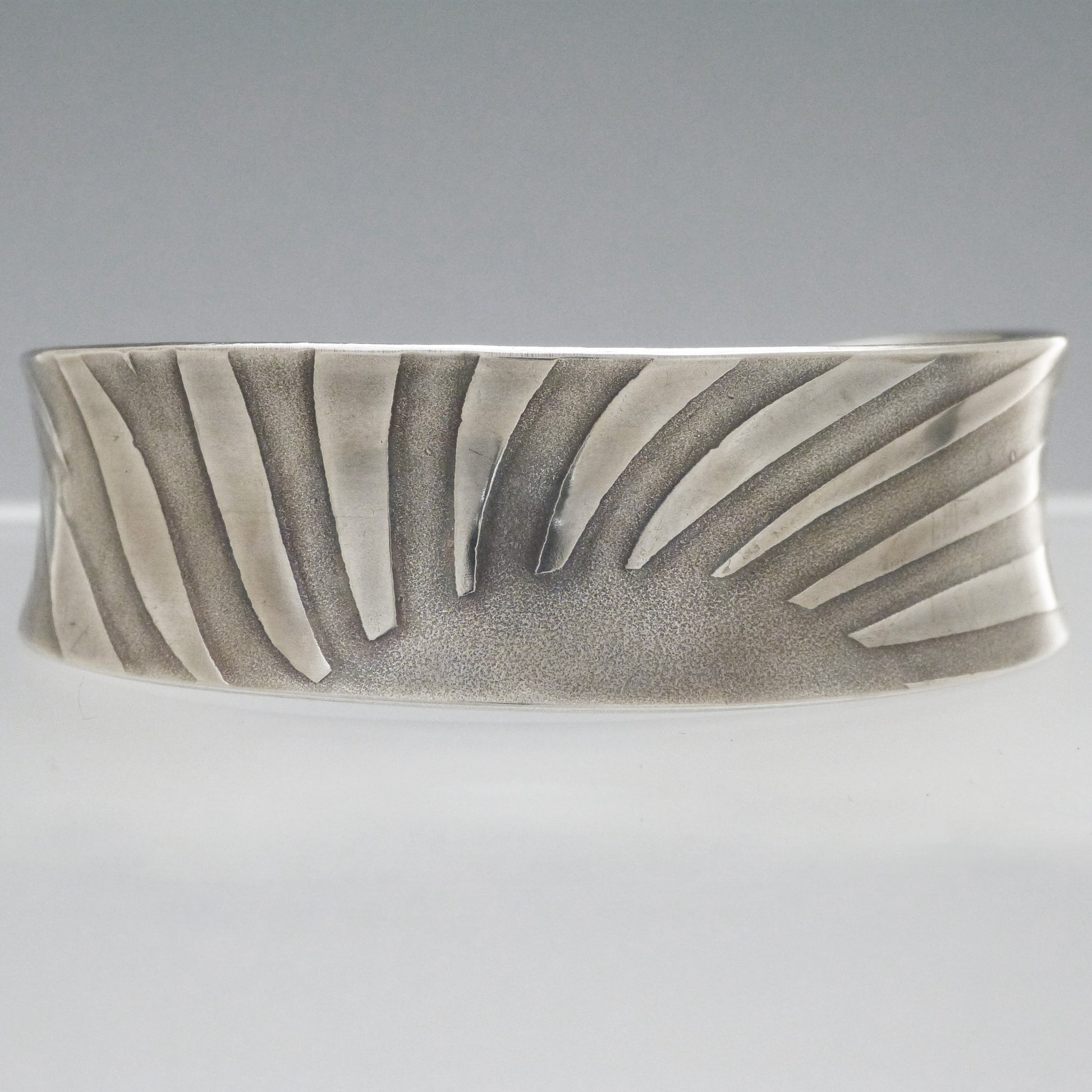 Treat yourself to this Sterling Sunrise Patterned Cuff - crafted with tarnish-resistant Sterling Silver for a shine that lasts! Stylishly sized to fit wrists between 6.5" and 7.5", it features a 7/8" wide design with a 1" opening and 2 5/8" across. The anticlastic shape feels super comfy, and the sunrise design is truly one of a kind!