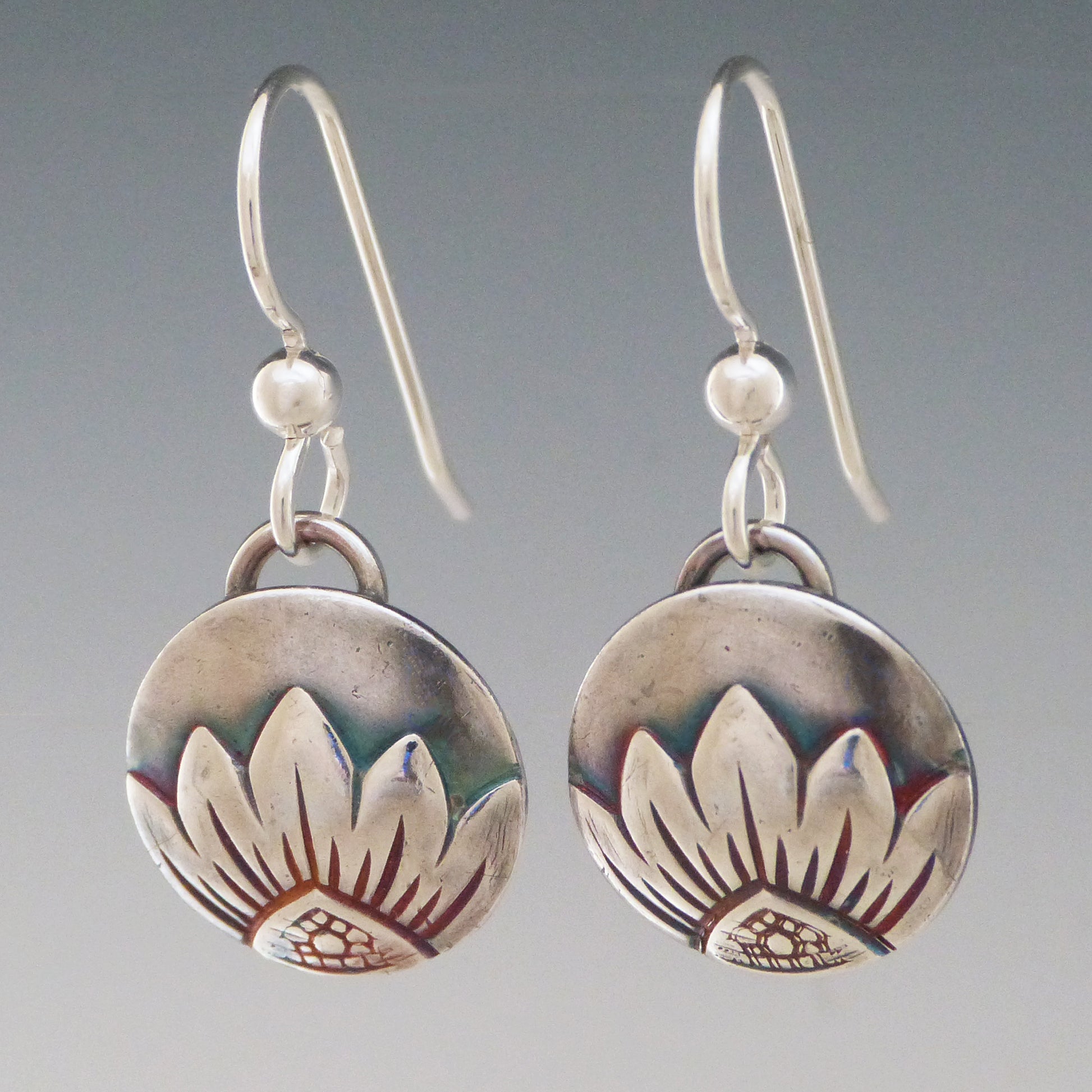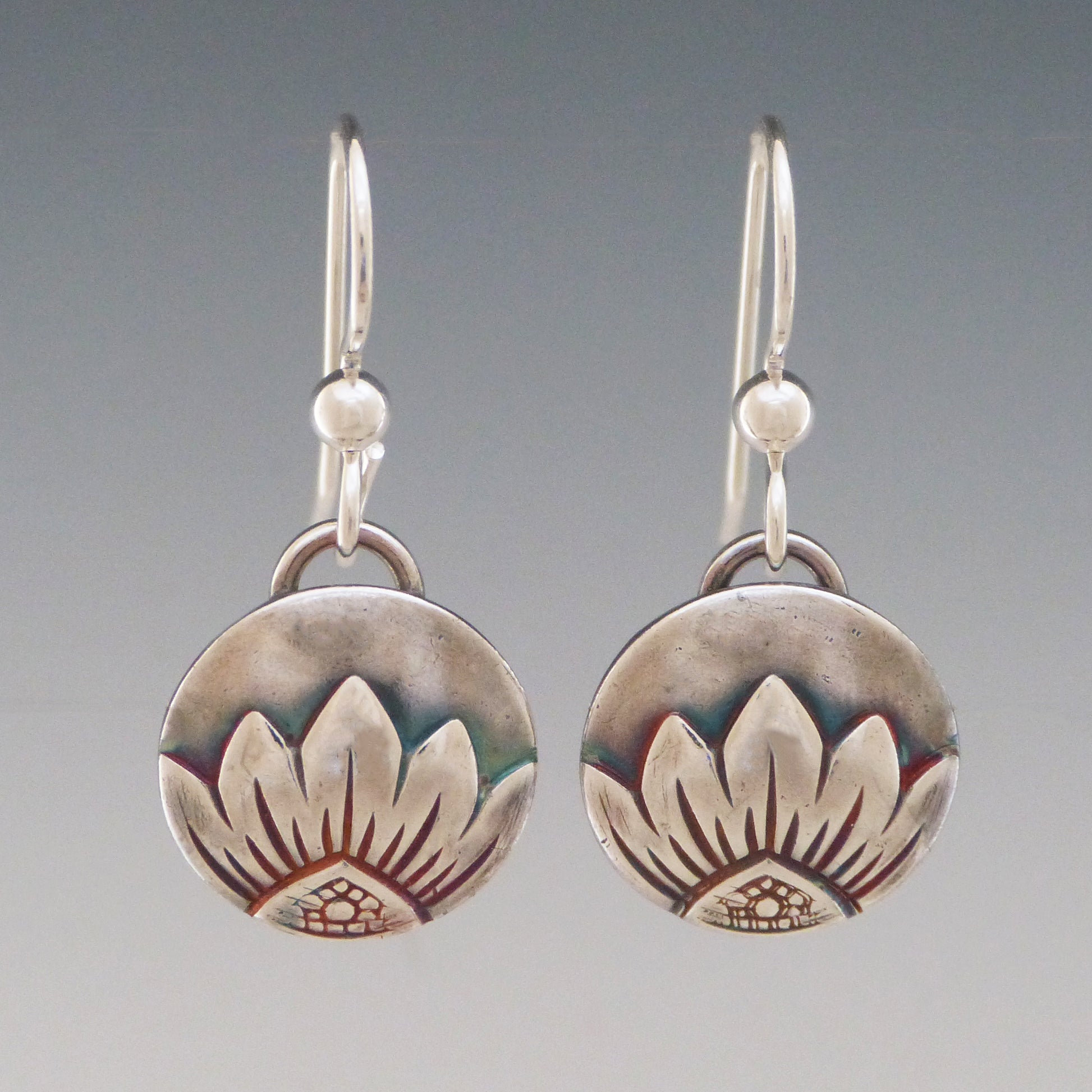 These Sunflower Earrings are crafted using .999 fine silver. Sterling silver ear wires. These unique sunflower earrings are a fun and gorgeous addition to any jewelry collection. These earrings measure to approx. 1/2" long and wide. A hand rubbed patina helps accent the beautiful details in these earrings.
