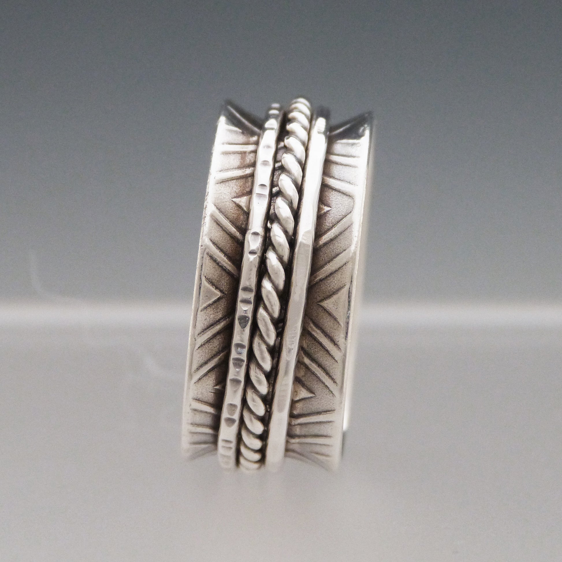 Treat yourself to our Triple Band Silver Spinner Ring, crafted with tarnish-resistant Argentium sterling silver! Three bands spin gracefully around the unique inner band design – plus, there are multiple variations to choose from! Ready to rock your finger? This bad boy is a size 10 1/4!