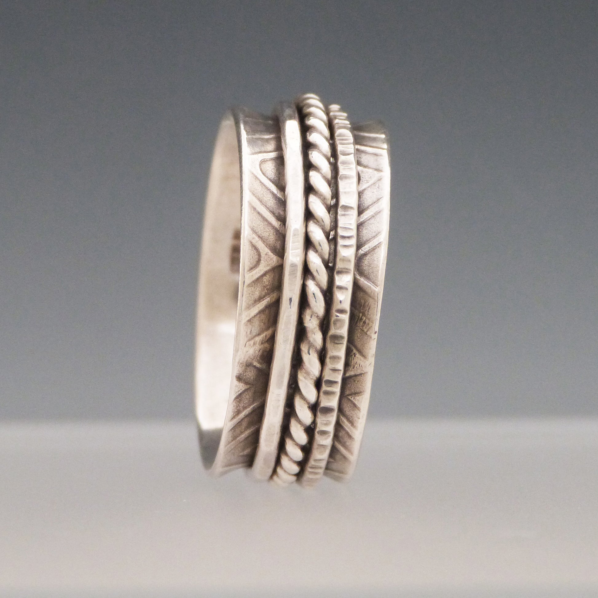 Triple Band Silver Spinner Ring crafted in tarnish resistant Argentium sterling silver. The outer bands spin around the inner band, also called a fidget ring. Unique inner band design. Multiple variations available on website. Size 10 1/2