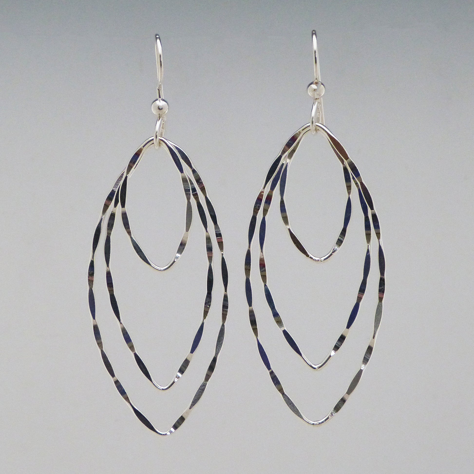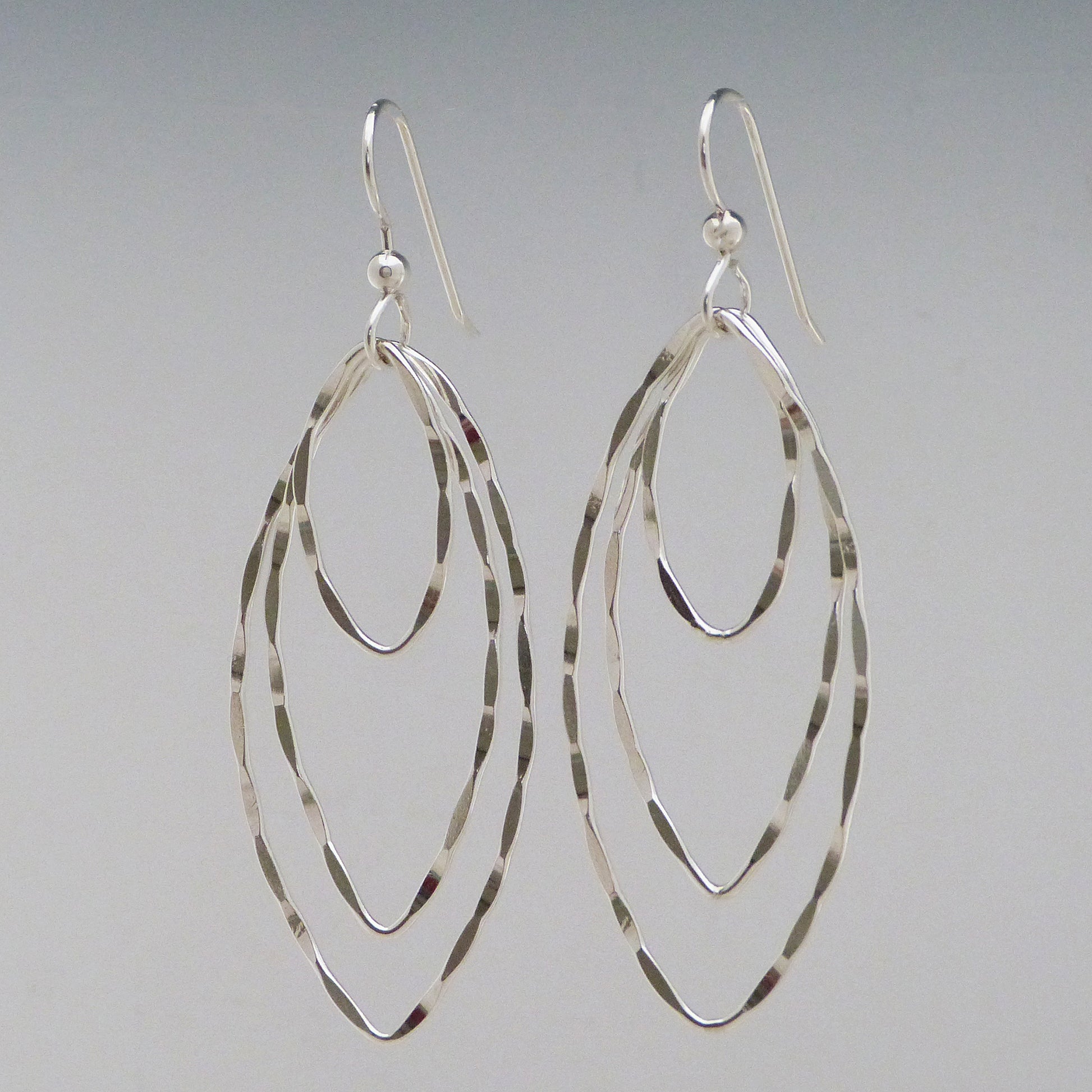 These triple hammered drop earrings are something special! Handcrafted with sterling silver, their sparkle and movement will make you feel like a million bucks. Better than that, you'll be the envy of your friends. Accessorize in style! Sterling silver ear wires.