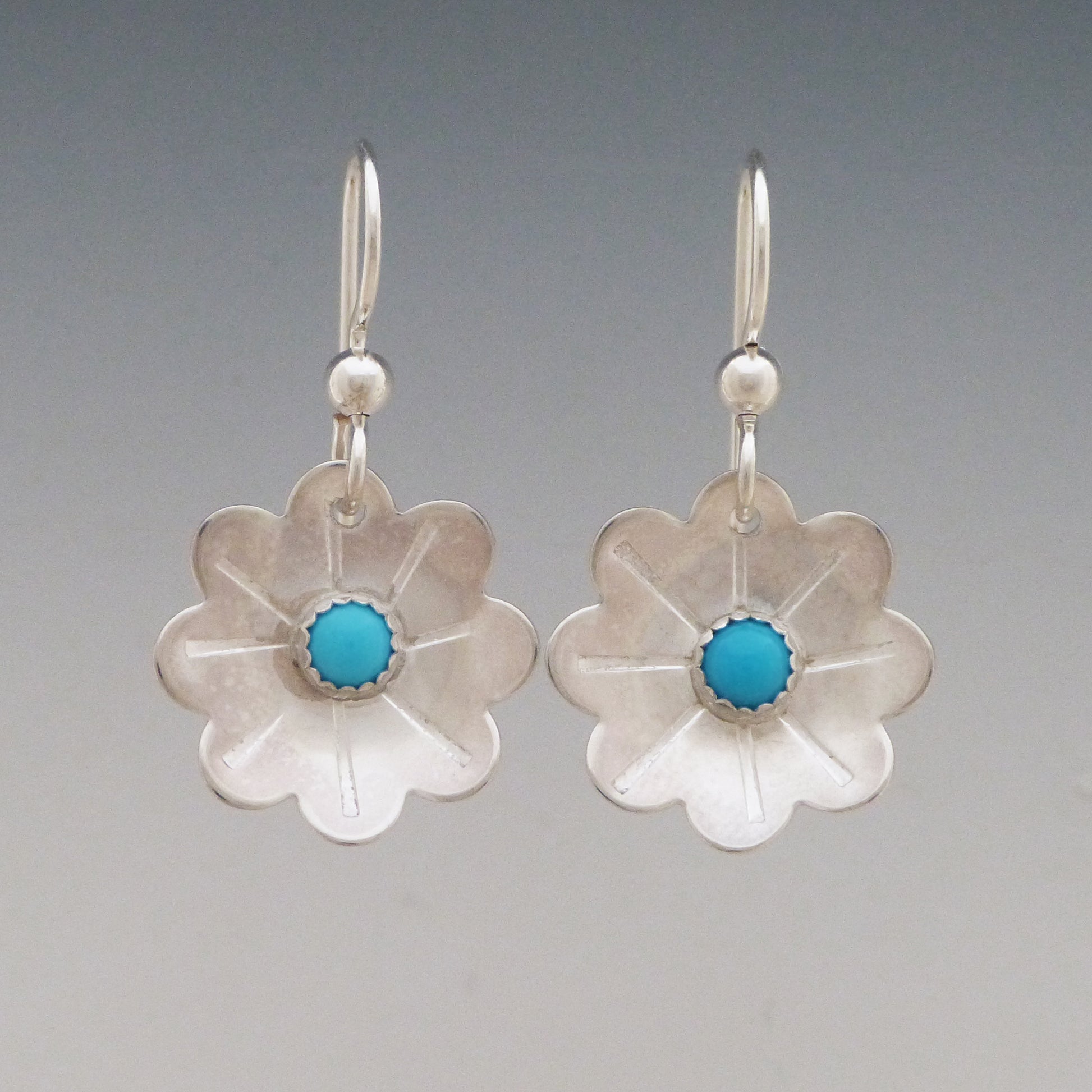 These Turquoise Gemstone Flower earrings are the ideal adornment to any jewelry wardrobe! The 4mm American-mined Turquoise stone blooms in the center of a beautifully detailed flower design. The earrings are around 5/8" long and wide, crafted using silver that's finer than fine - .999 pure silver with sterling silver ear wires!