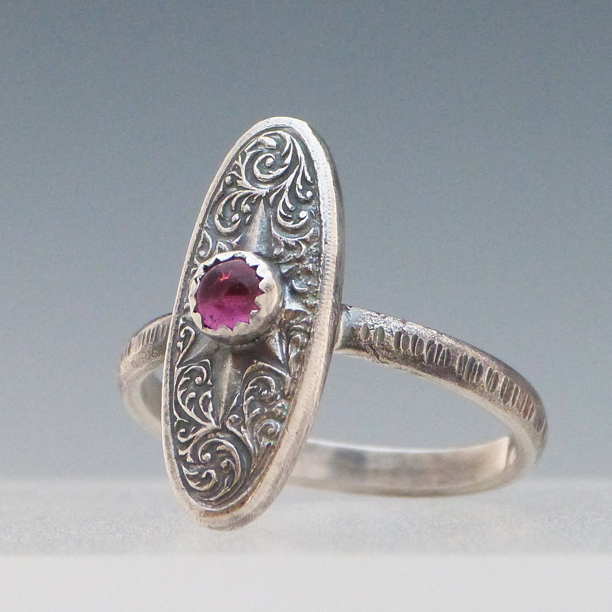 Navigate your style with our Victorian Compass Ring. Crafted from .999 fine silver, this tarnish resistant sterling silver band is hammered for texture and durability. Adorned with a 4mm round pink tourmaline, this dainty piece was made using an antique Victorian die. Find your way to fashion with this unique and quirky ring.