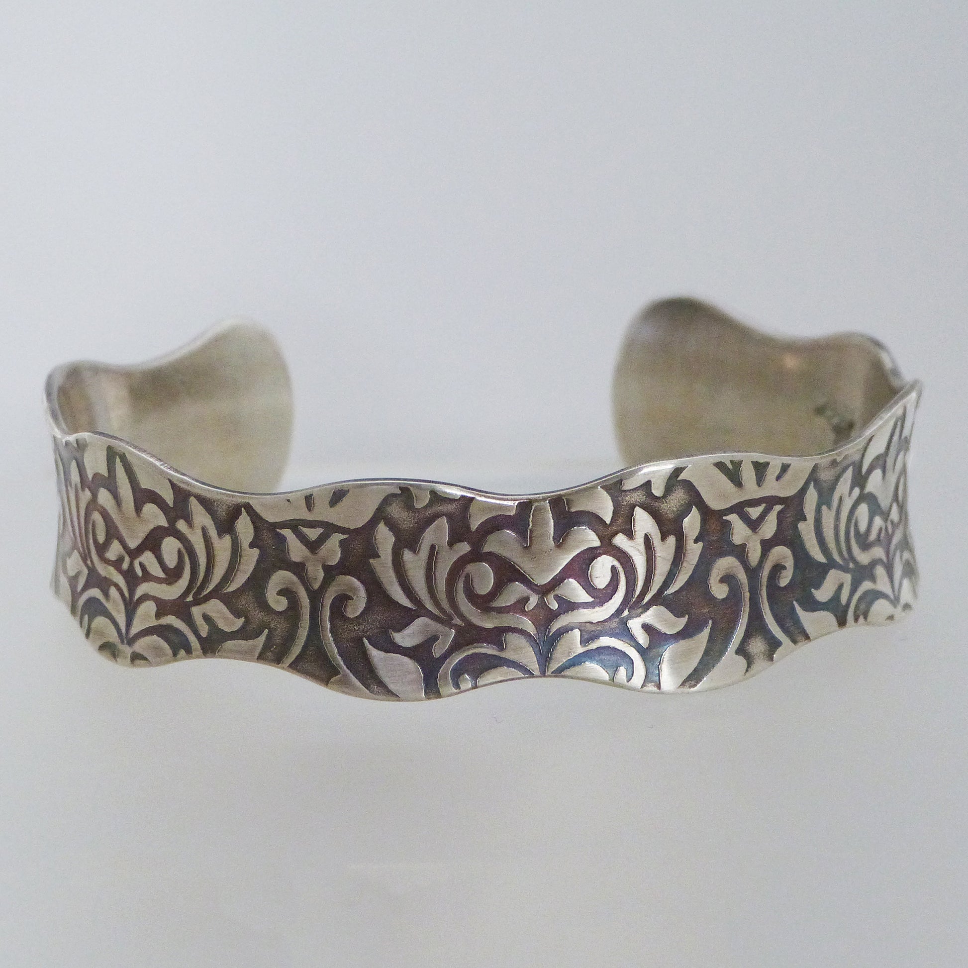 Look stunningly Victorian with this floral cuff! Handcrafted with a subtle colorful patina, this piece is sure to make an impact; it's wide enough for a statement, but fits comfortably on a 6 to 7" wrist. Whoever said "you can't have style and comfort" clearly hasn't seen this cuff! Opening is approx. 1" and width is approx. 3/4".
