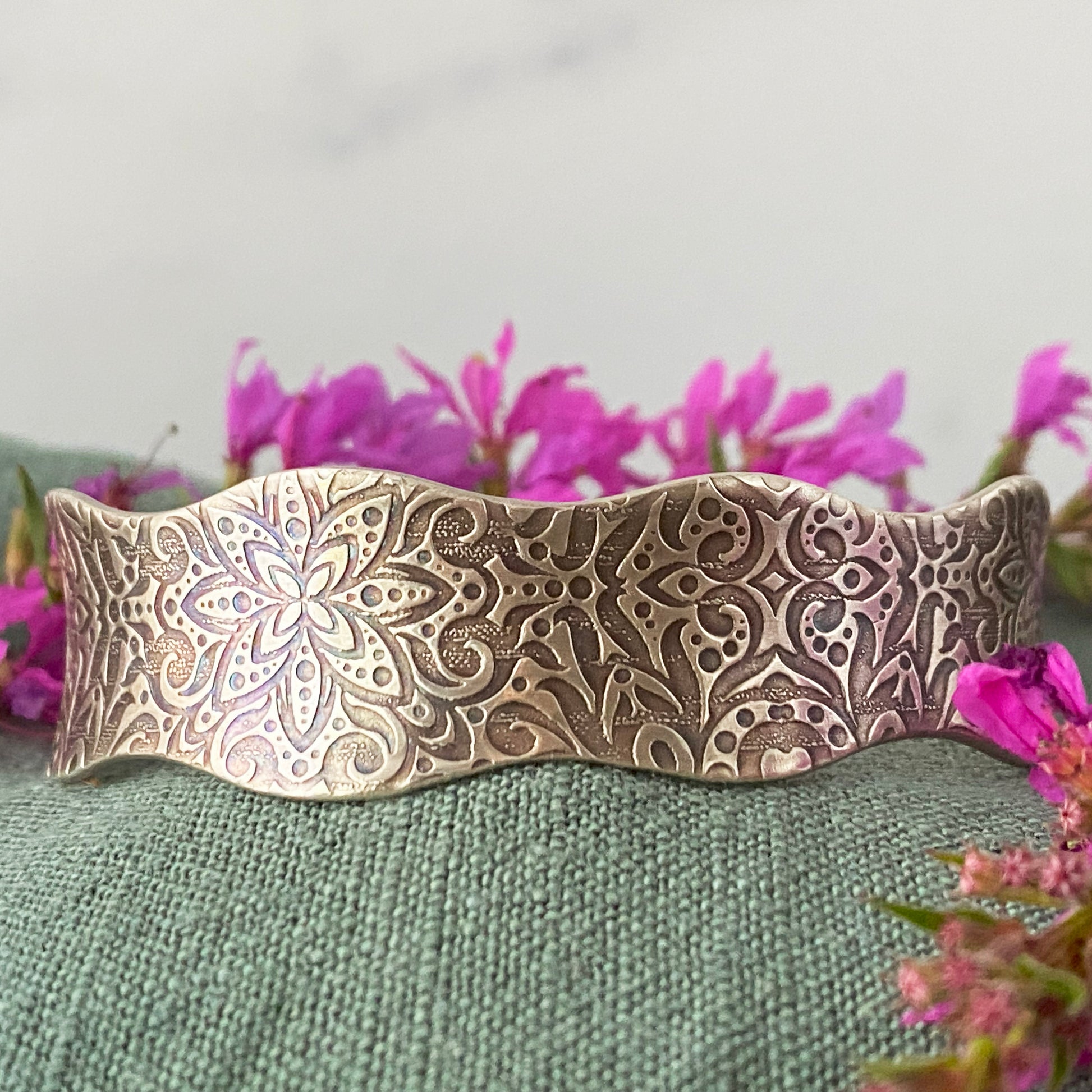Add a touch of whimsy to your wardrobe with this Victorian Floral Wavy Anticlastic Cuff. Handcrafted using Argentium tarnish resistant sterling silver, this cuff is not only beautiful but also durable. Fits wrists between 6-6.5", making it a perfect addition to any outfit. (Silver lining: it won't tarnish!) This cuff measures at a 6.25" circumference and a 2.5" radius with a 1" opening.