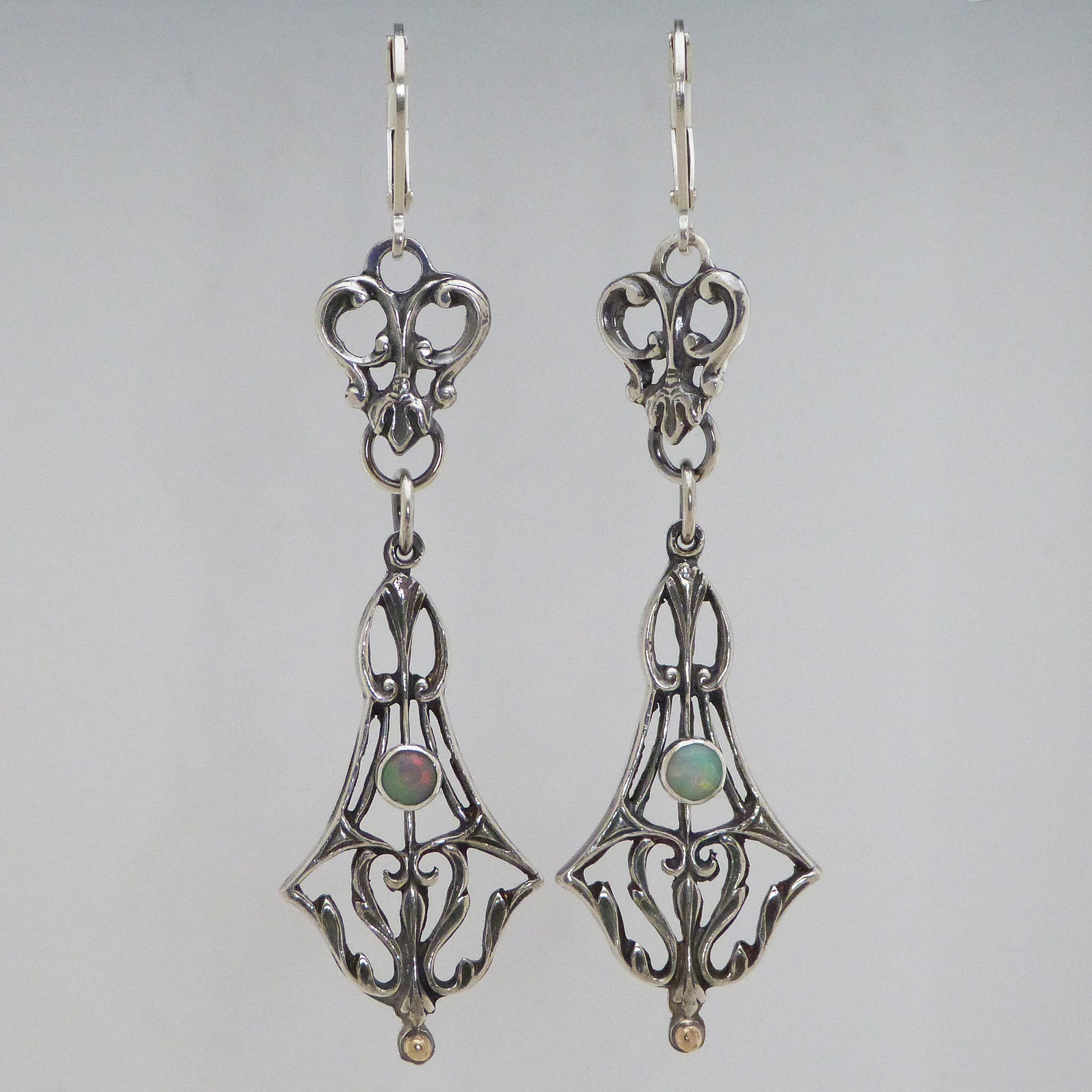 These Victorian-inspired earrings are sure to make a statement! With a 4mm Ethiopian Opal, sterling silver clasping ear wires, and a touch of 22k gold shot, these handmade, 2" stunners are sure to become a jewelry box favorite! Plus, you can always count on a bit of luck if you wear opal!