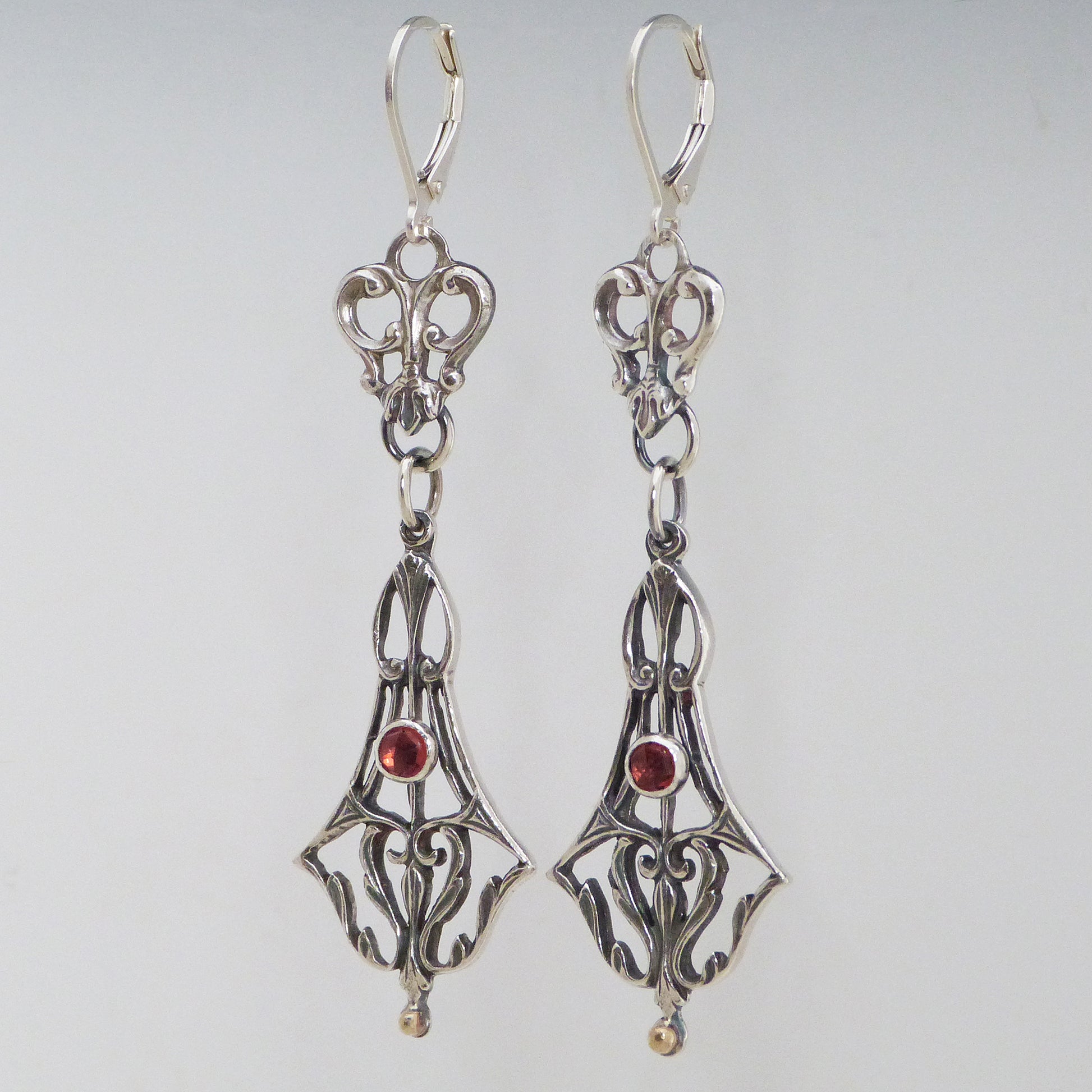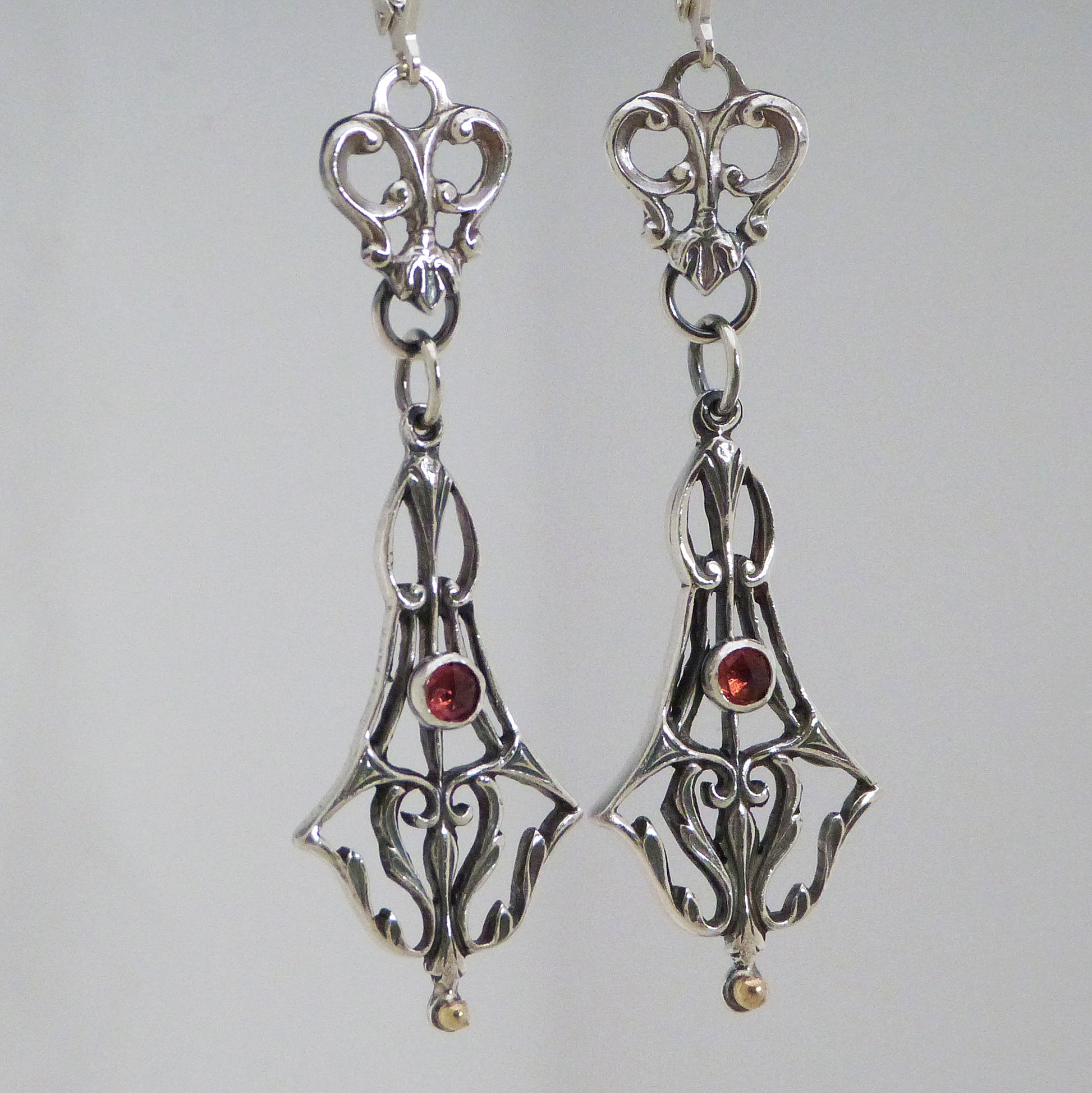 Why not add a dash of Victorian flair to your look? These unique hand pierced earrings make a statement with their 4mm rose cut Garnet and 22k gold shot. The sterling silver clasping ear wires hold the 2” long, fine silver masterpiece securely and comfortably. Handmade with love, these earrings will give your ensemble that special vintage touch.