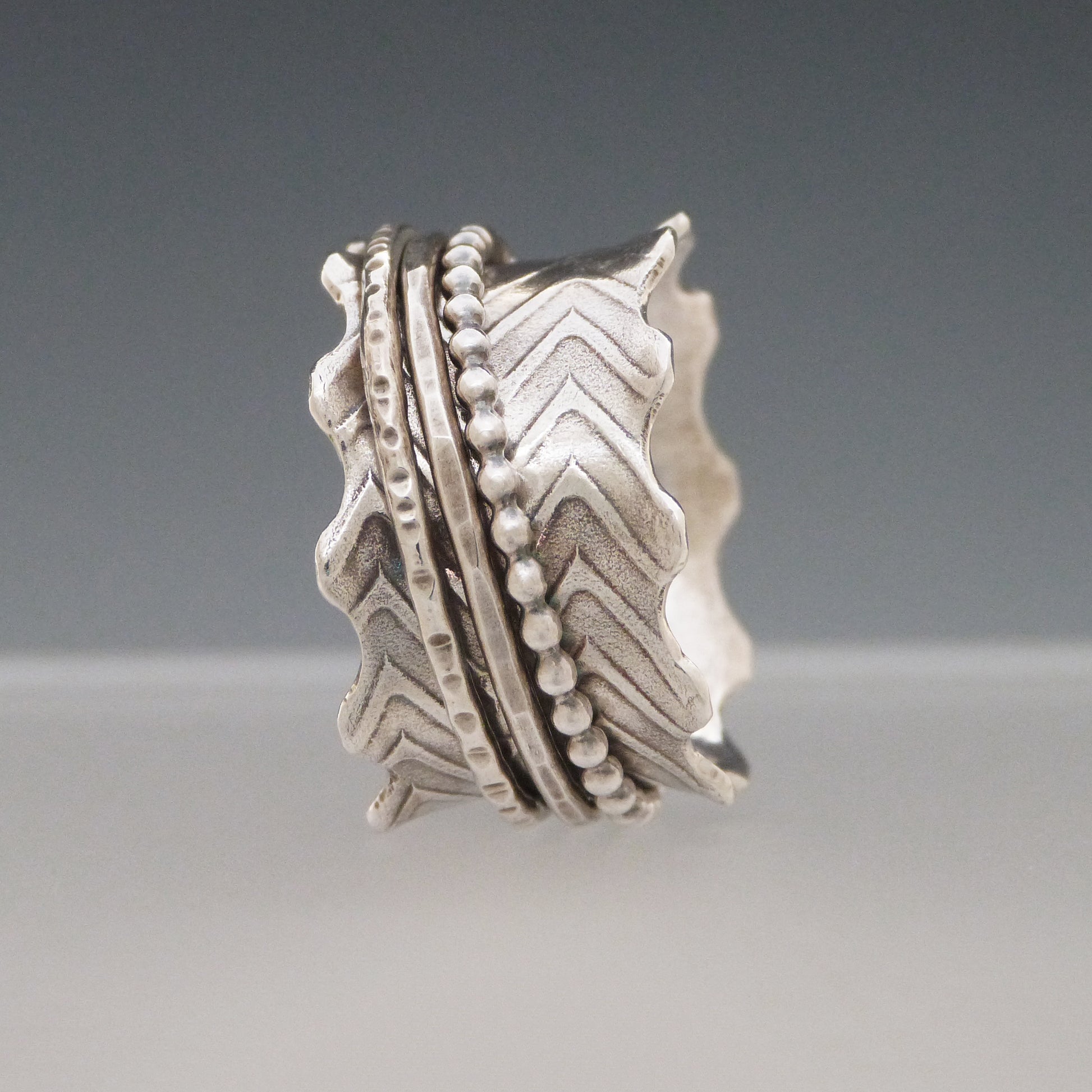 Wavy Edge Spinner Ring crafted in tarnish resistant Argentium sterling silver. The outer bands spin around the inner band, also called a fidget ring. Unique inner band zigzag texture. Multiple variations available on website. Size 7 1/2.